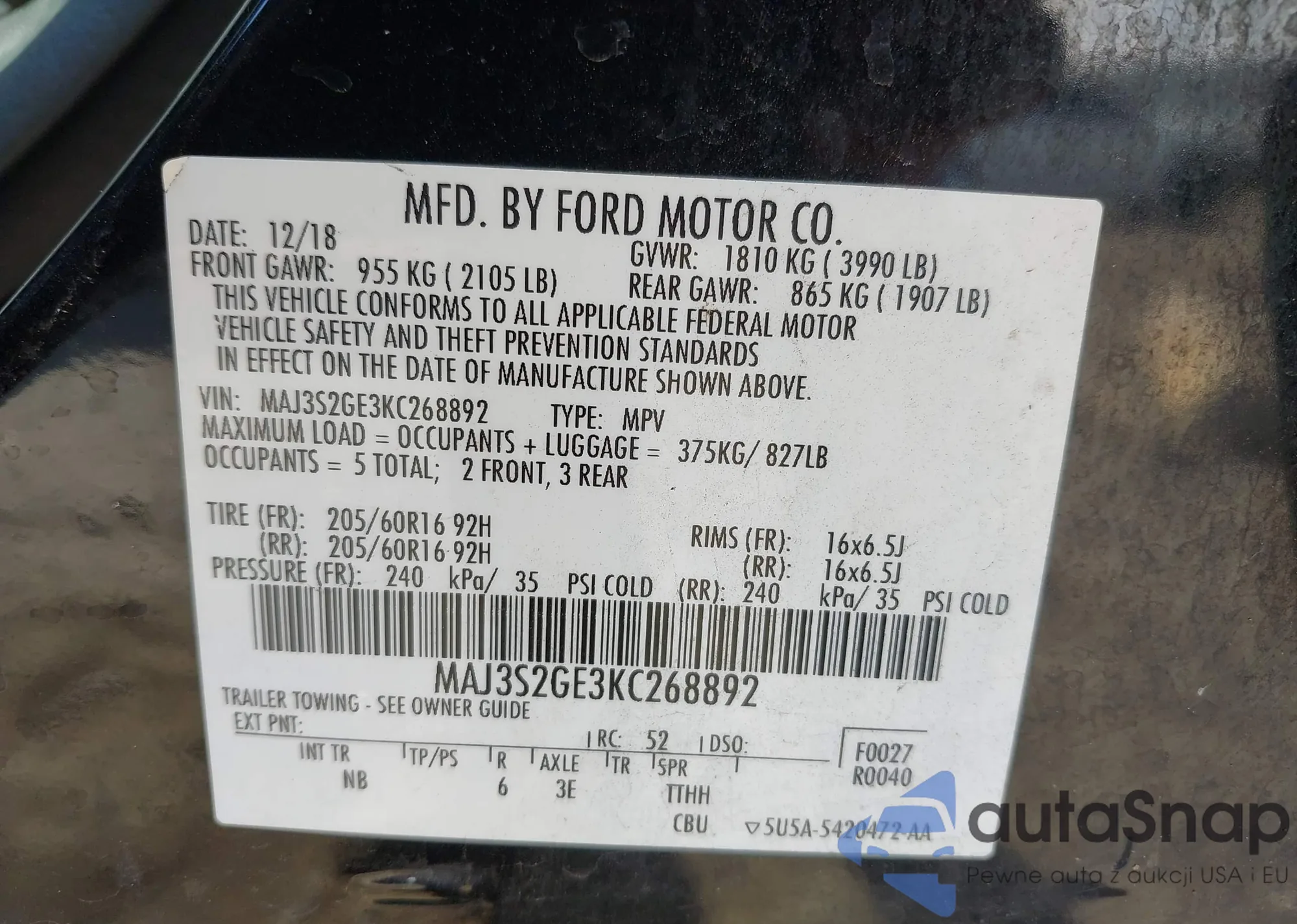 LOT: 42029558 VIN: MAJ3S2GE3KC268892
