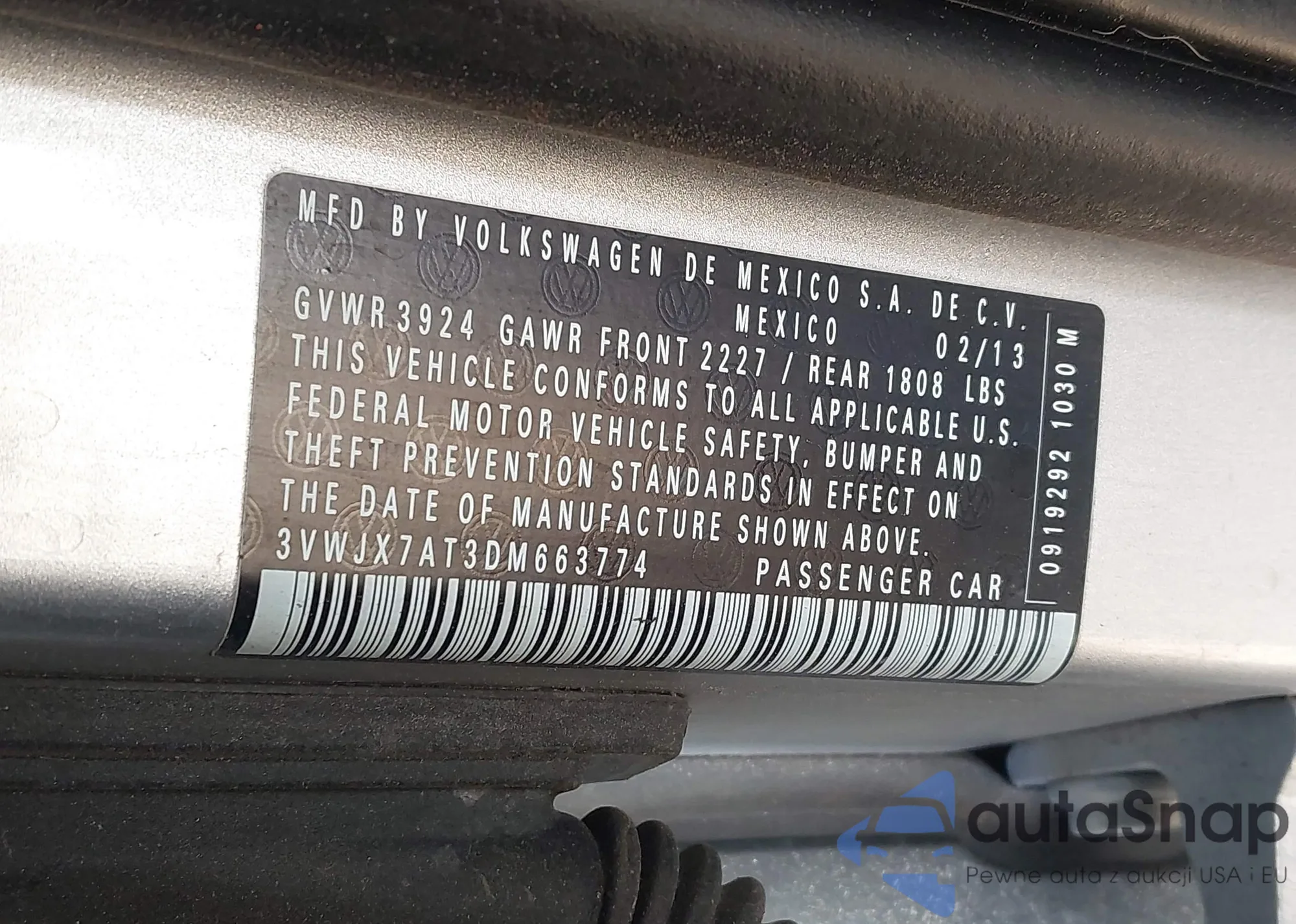 • VIN 3VWJX7AT3DM663774