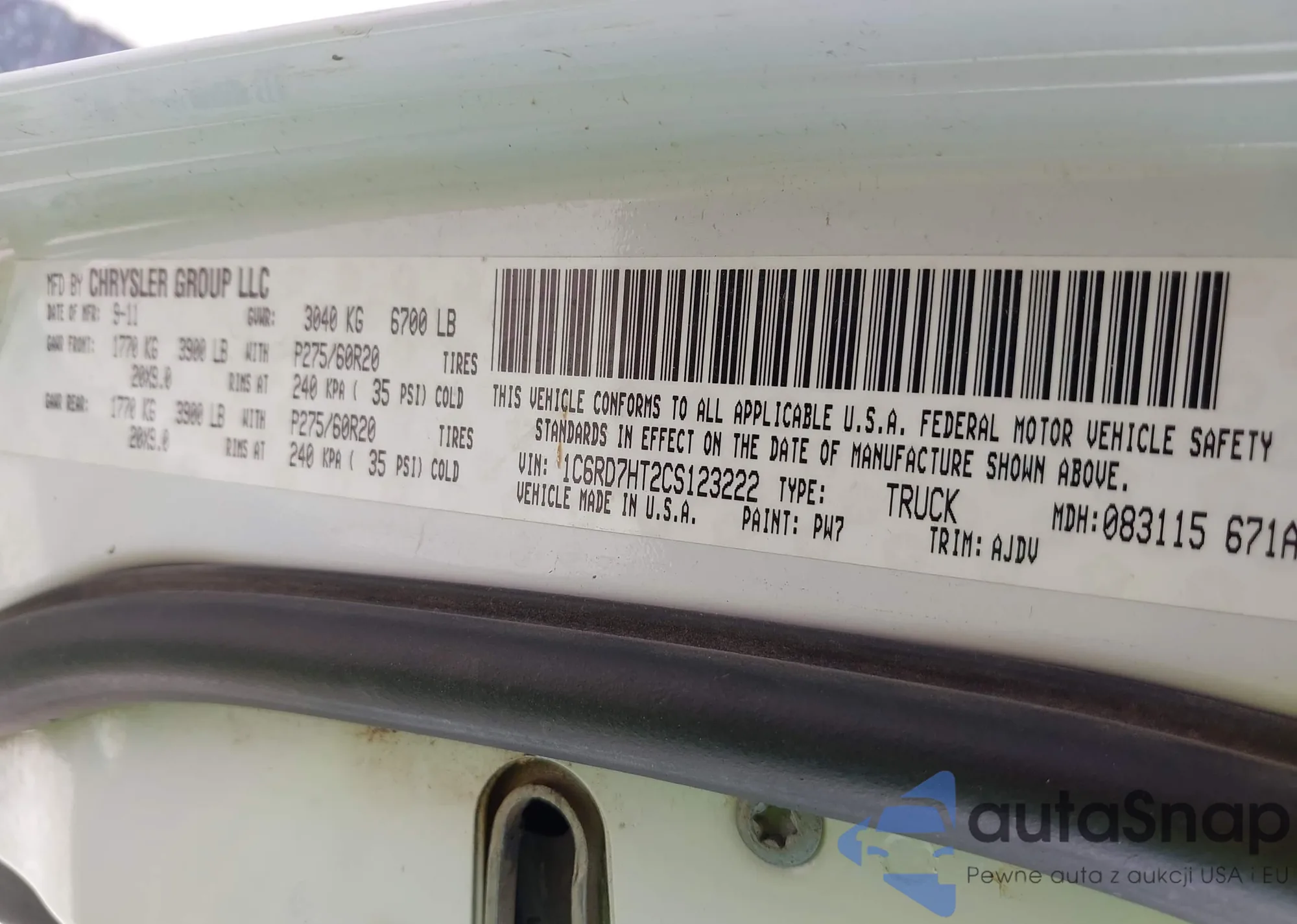LOT: 42032377 VIN: 1C6RD7HT2CS123222