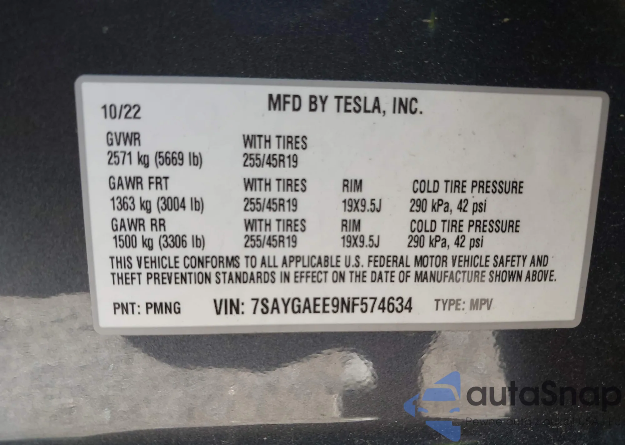 • VIN 7SAYGAEE9NF574634