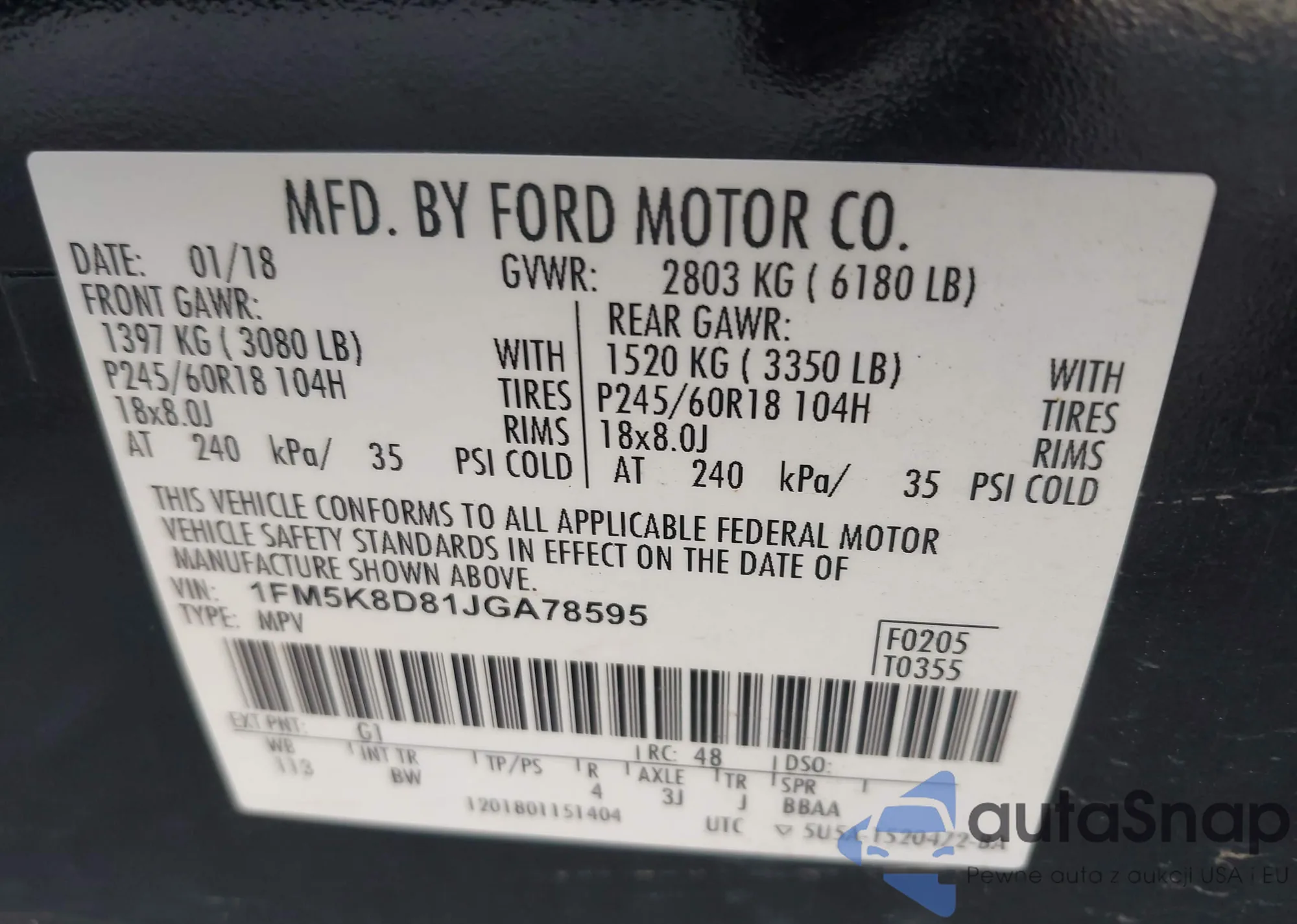 LOT: 42057196 VIN: 1FM5K8D81JGA78595