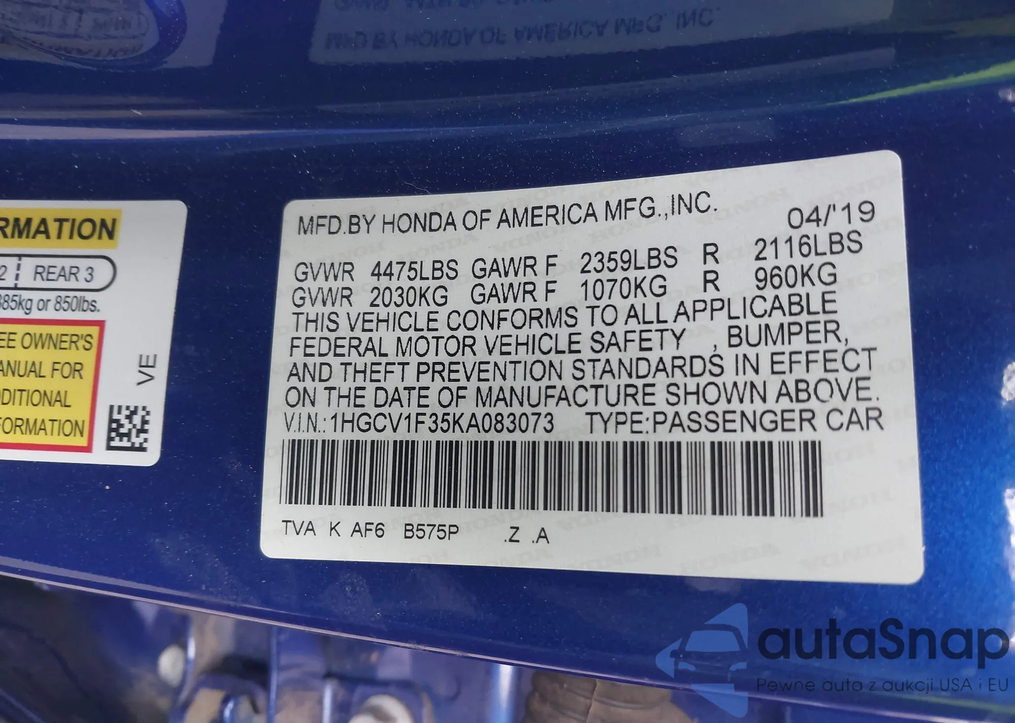 LOT: 42169127 VIN: 1HGCV1F35KA083073