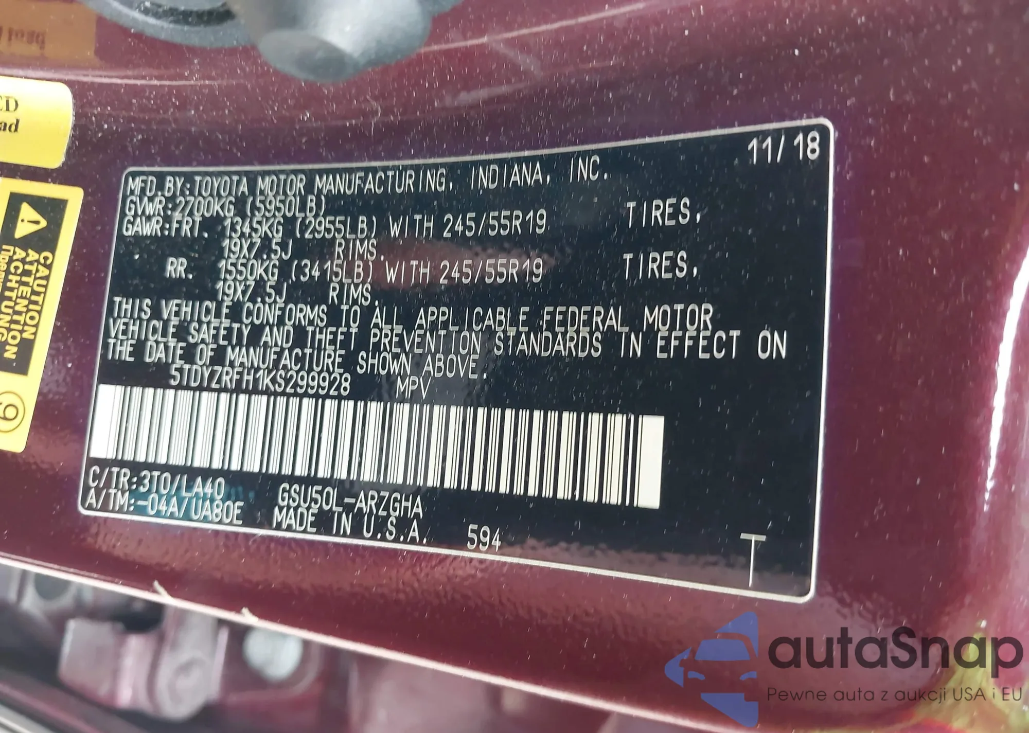 LOT: 41901878 VIN: 5TDYZRFH1KS299928