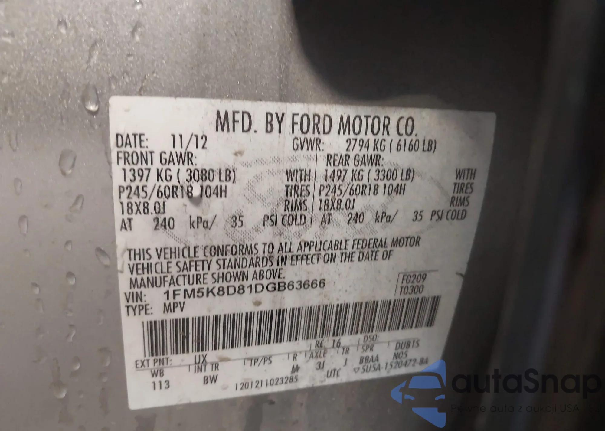 LOT: 42211087 VIN: 1FM5K8D81DGB63666