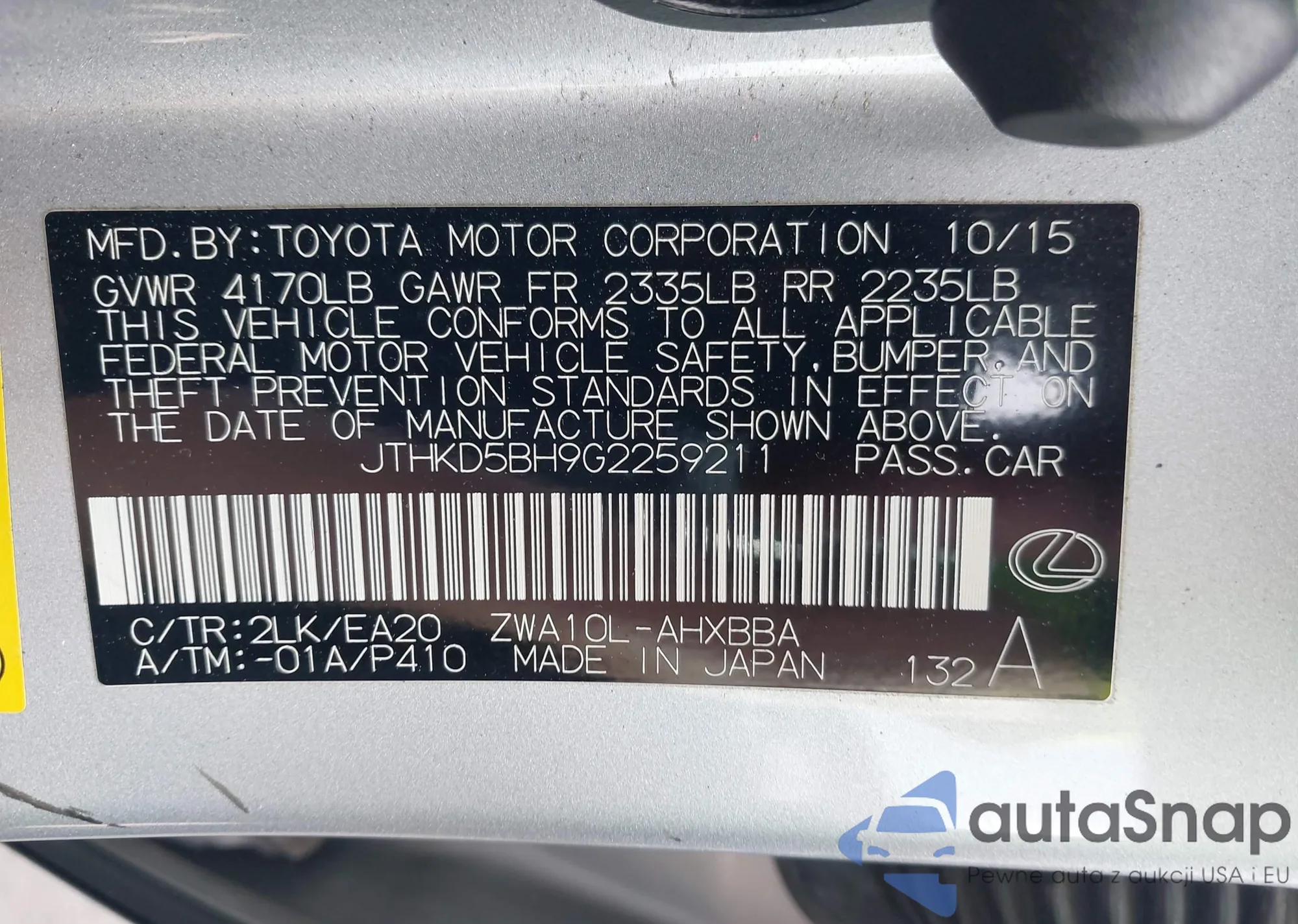 LOT: 41900277 VIN: JTHKD5BH9G2259211