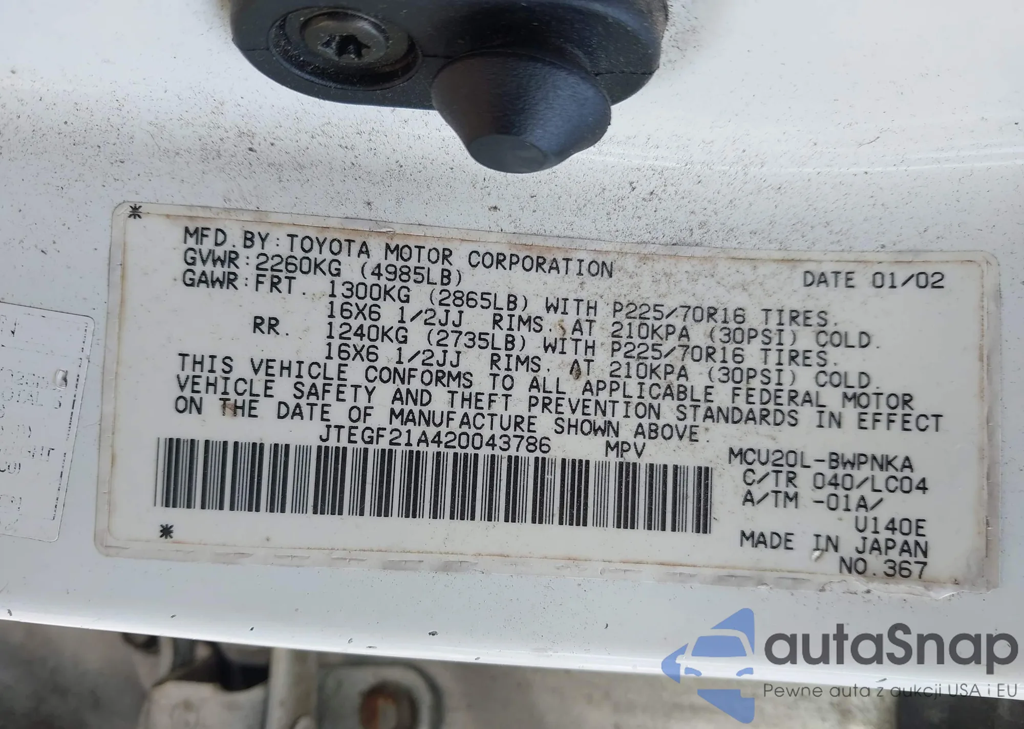 LOT: 42081236 VIN: JTEGF21A420043786