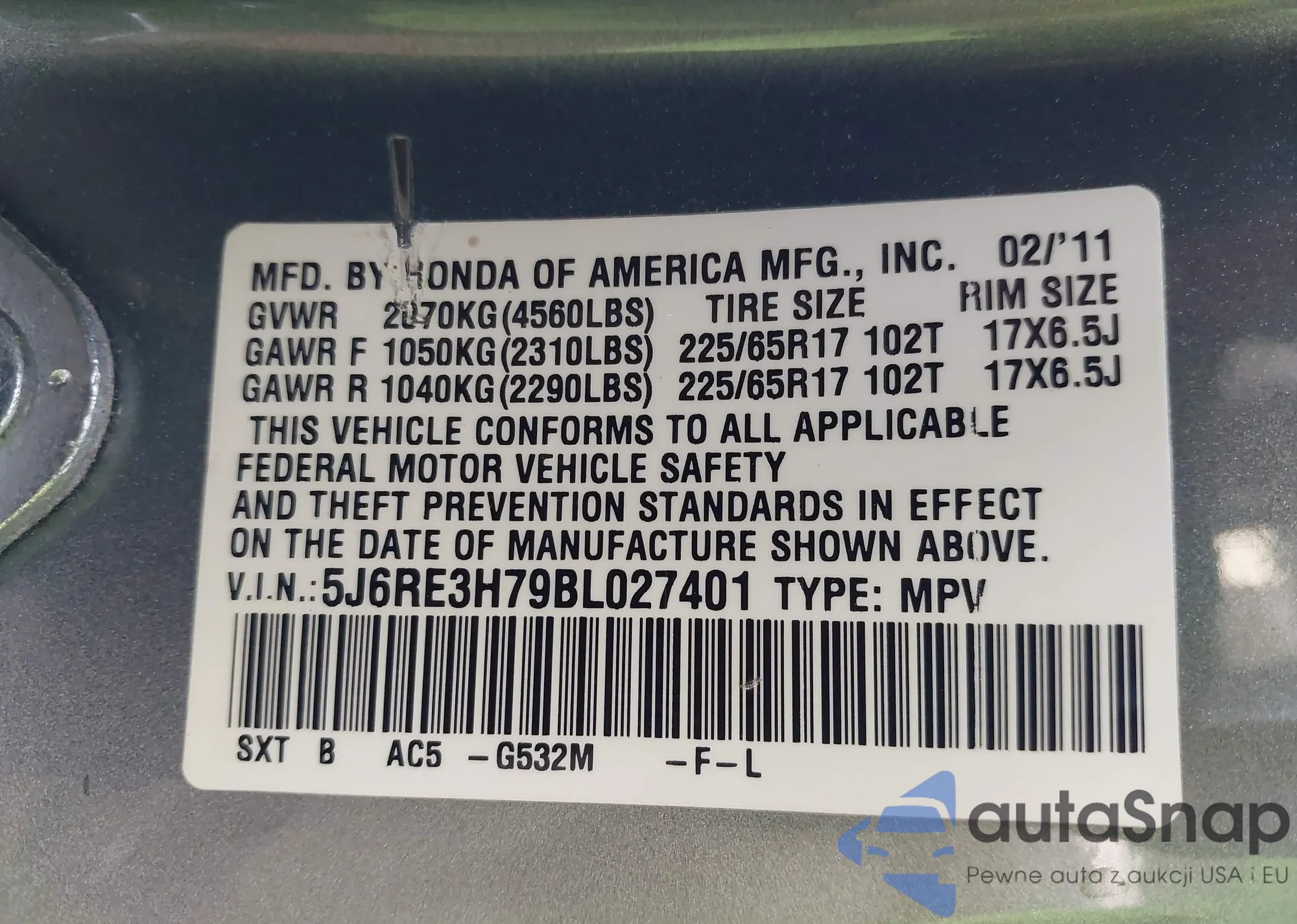 • VIN 5J6RE3H79BL027401