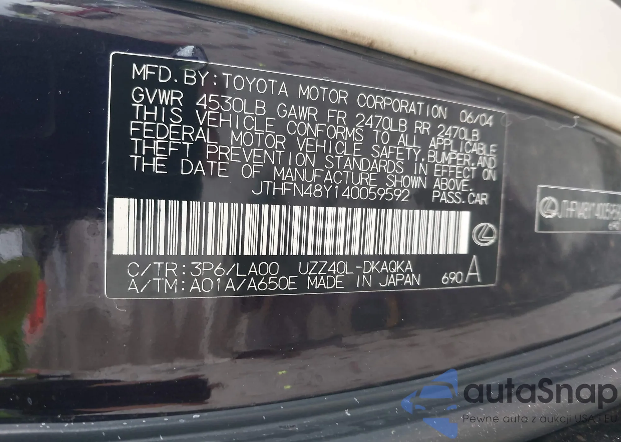 LOT: 42189576 VIN: JTHFN48Y140059592