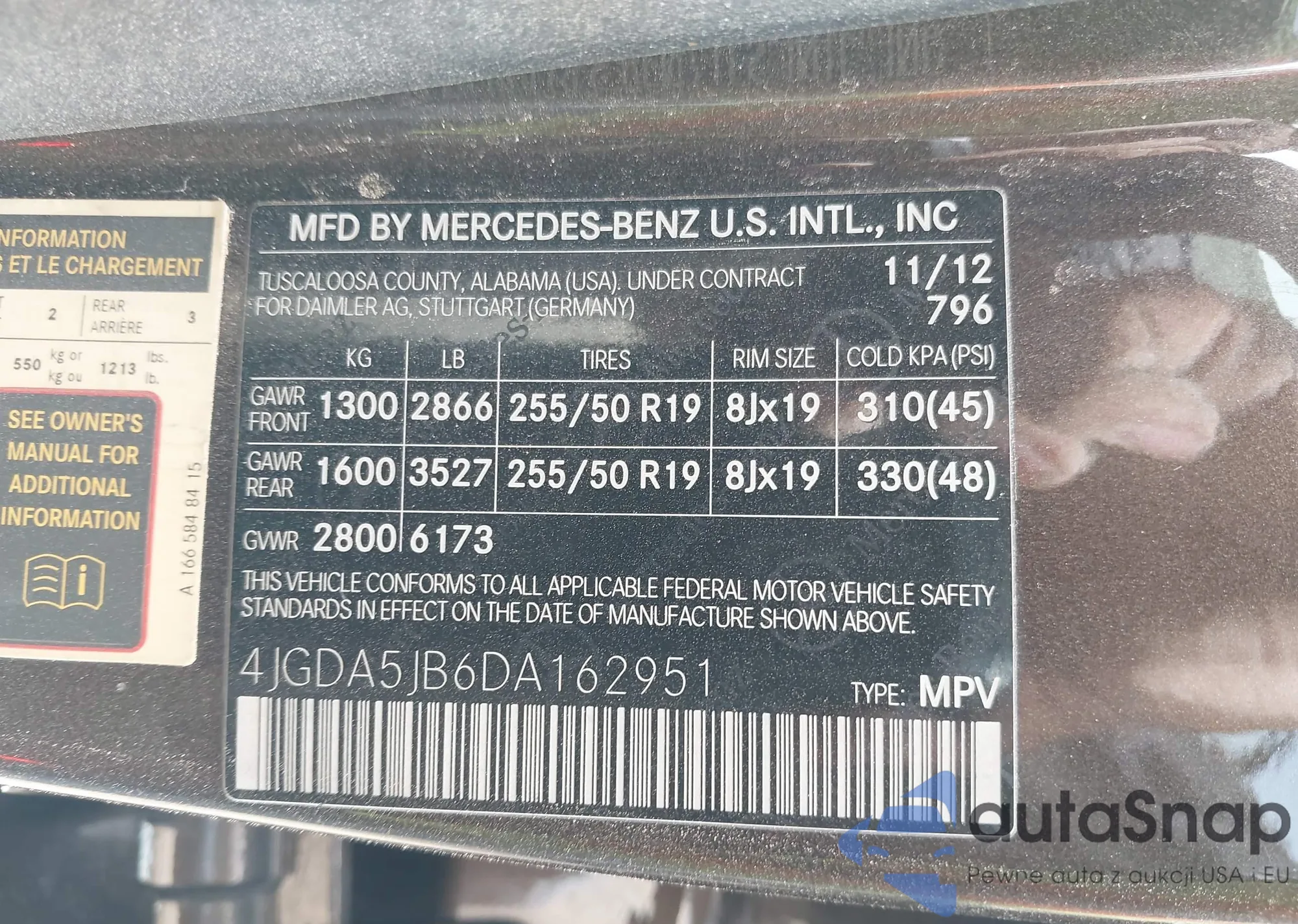 2013 Mercedes-Benz Ml 350 from USA, damaged, VIN 4JGDA5JB6DA162951
