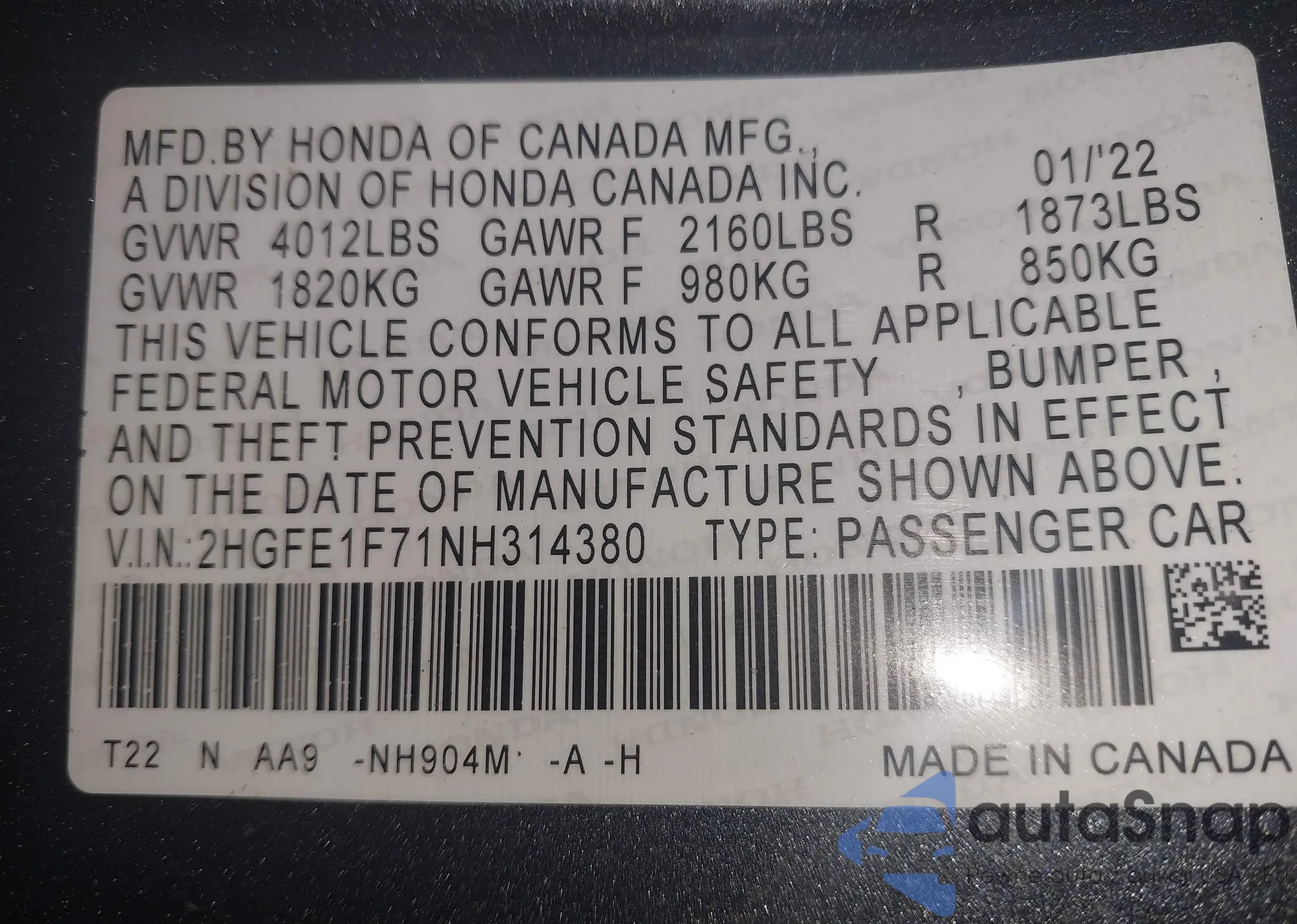 • VIN 2HGFE1F71NH314380