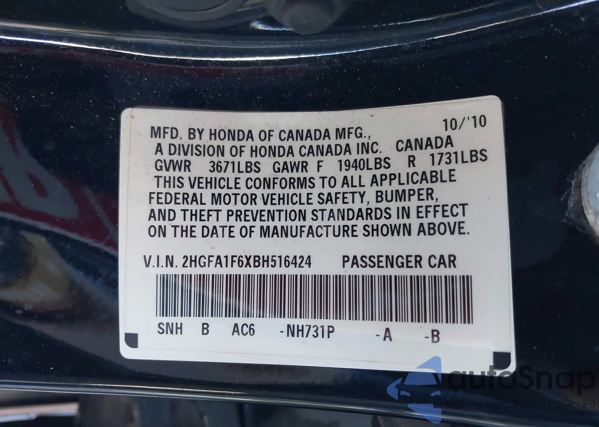 • VIN 2HGFA1F6XBH516424