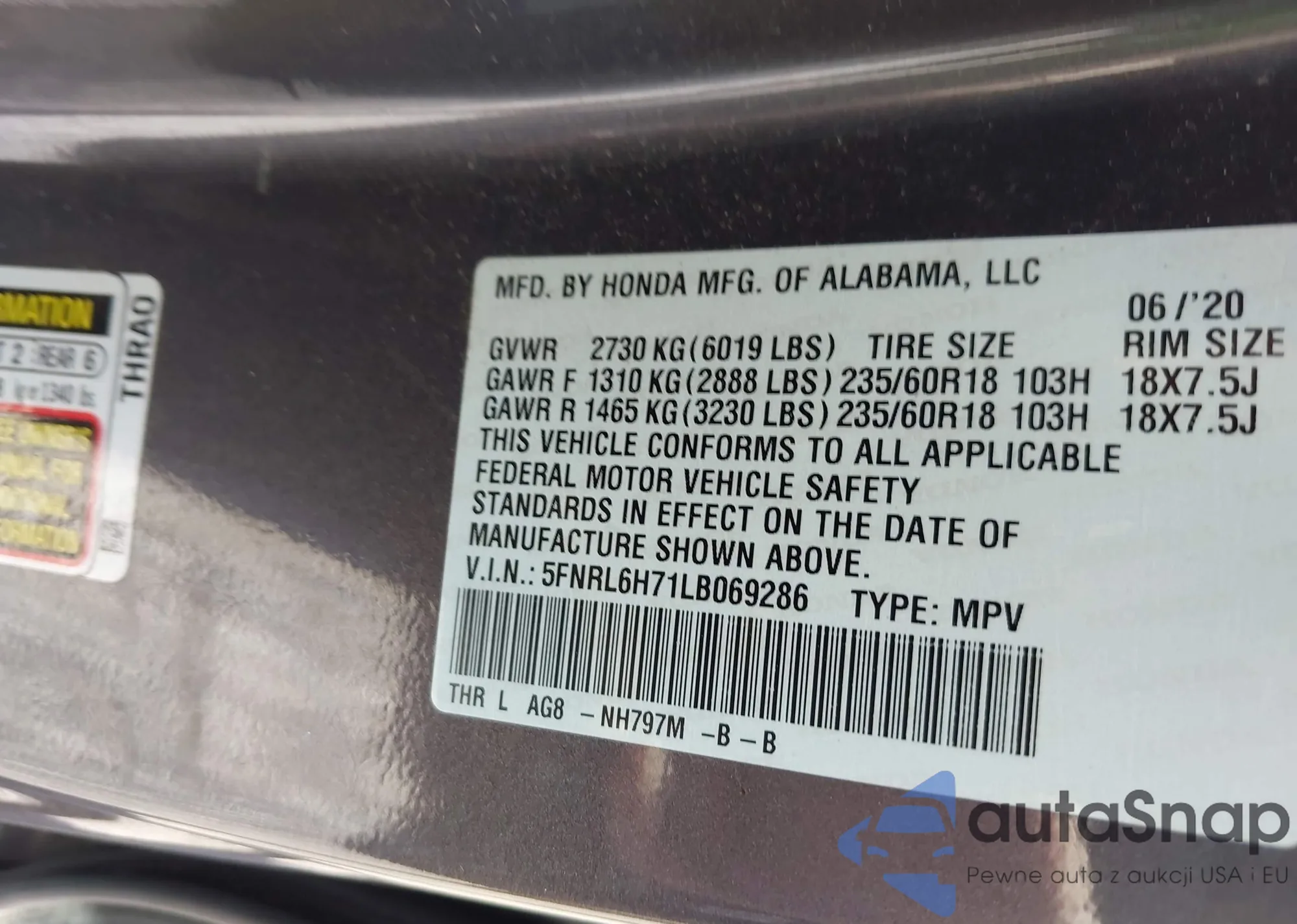 • VIN 5FNRL6H71LB069286