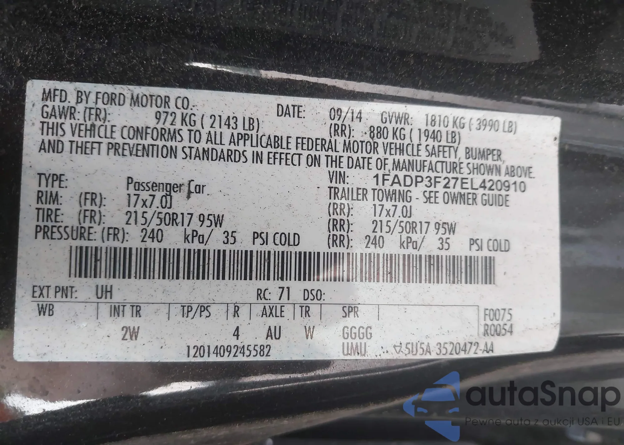 LOT: 42045953 VIN: 1FADP3J29JL254861
