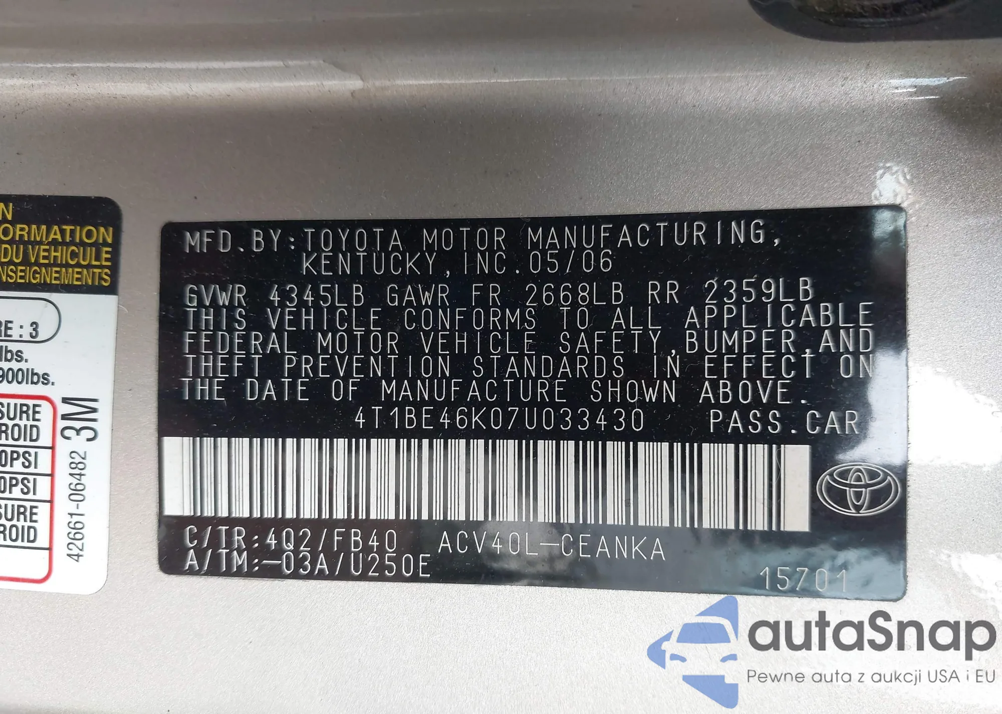 LOT: 42204900 VIN: 4T1BF30K15U086182