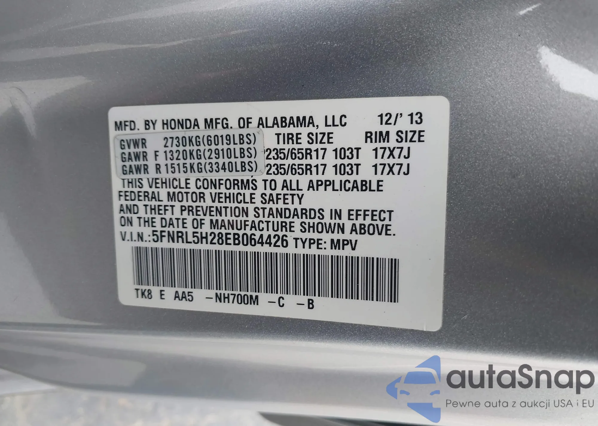 LOT: 42139097 VIN: 5FNRL6H71SB038036
