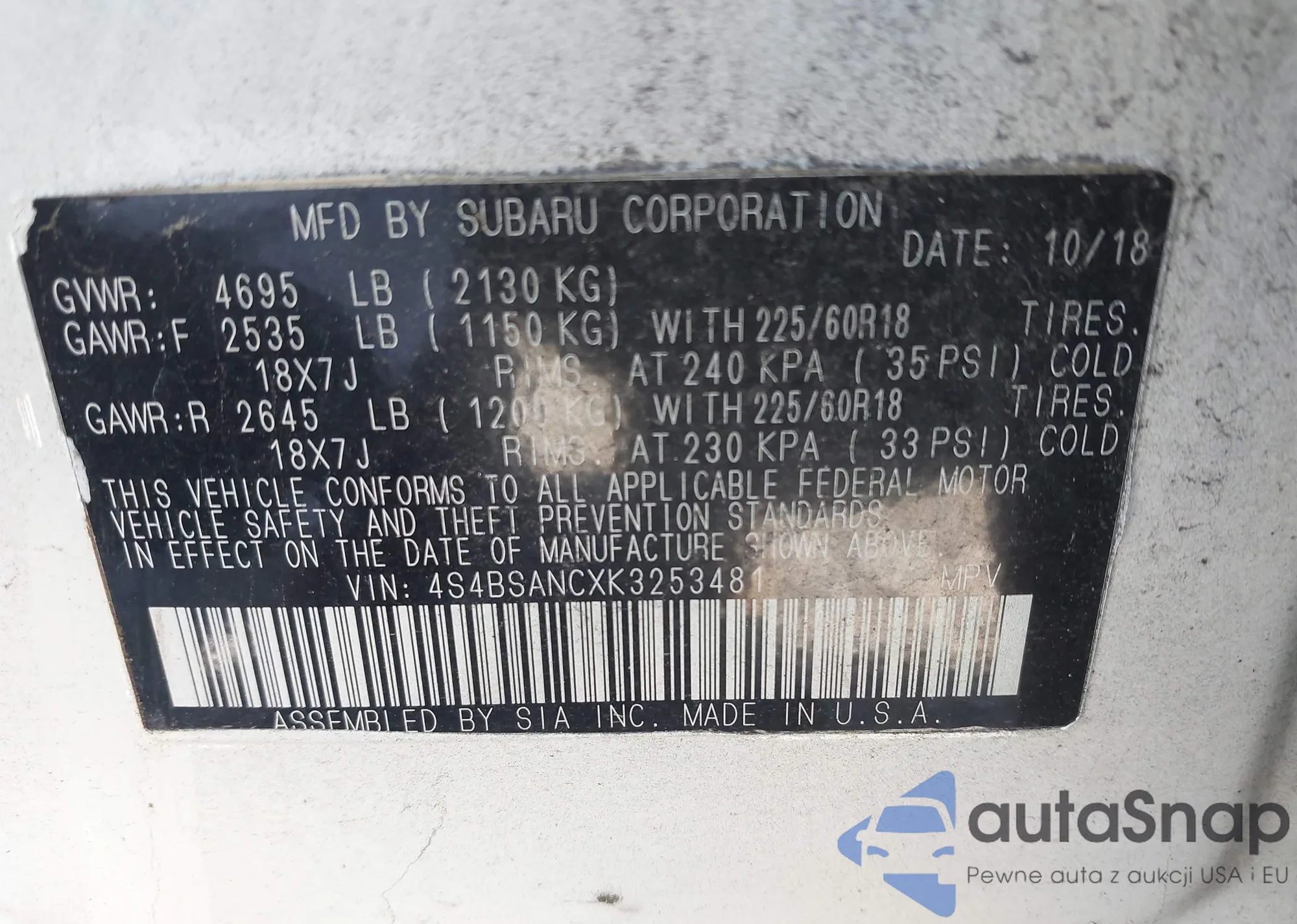 LOT: 41802461 VIN: 4S4BSANCXK3253481