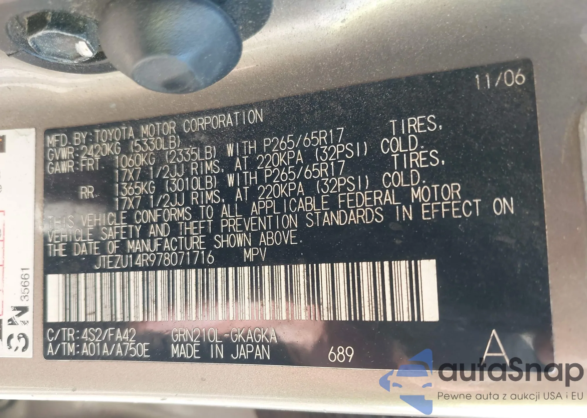 LOT: 42012213 VIN: JTEZU14R978071716