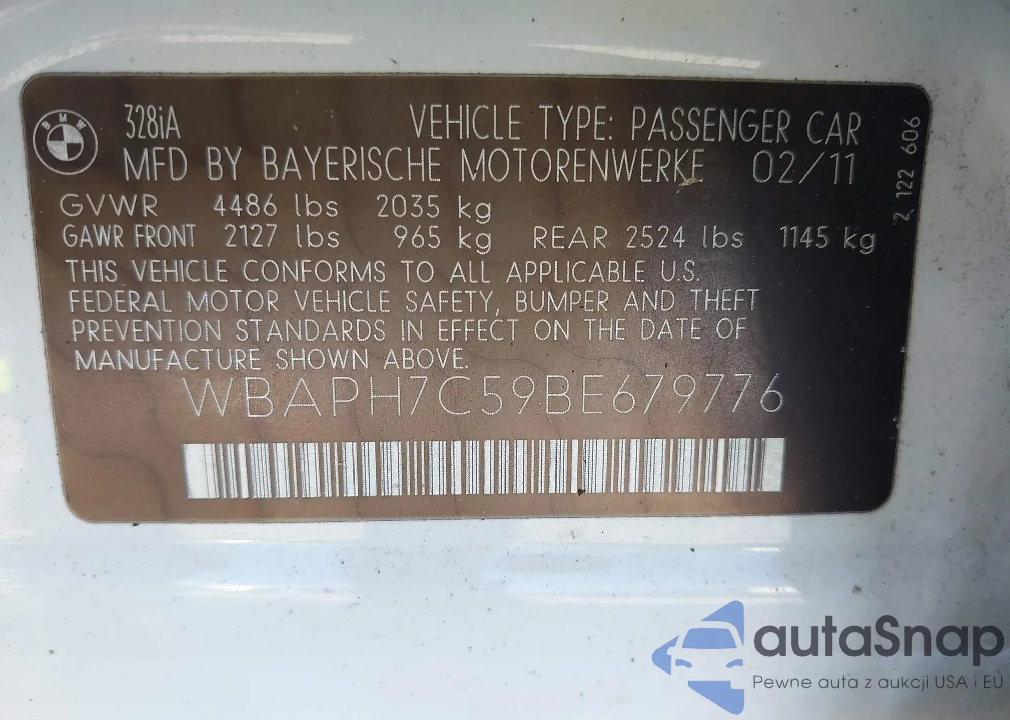 LOT: 42300499 VIN: WBAPH7C59BE679776