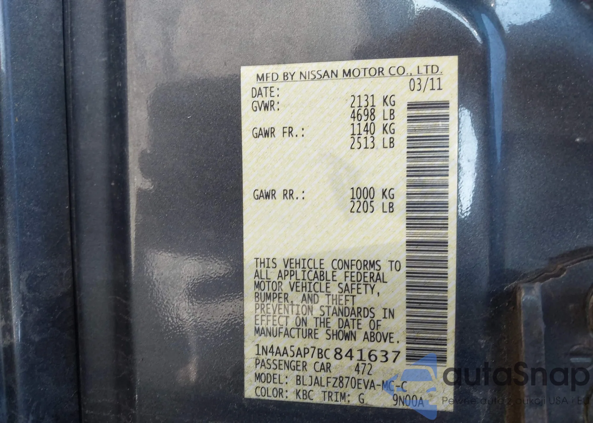 • VIN 1N4AA5AP7BC841637