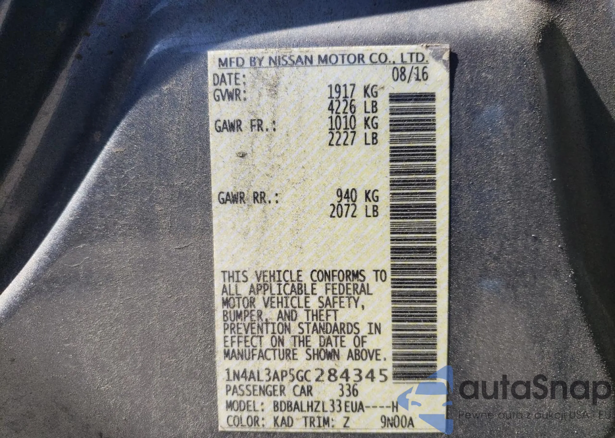 • VIN 1N4AL3AP5GC284345