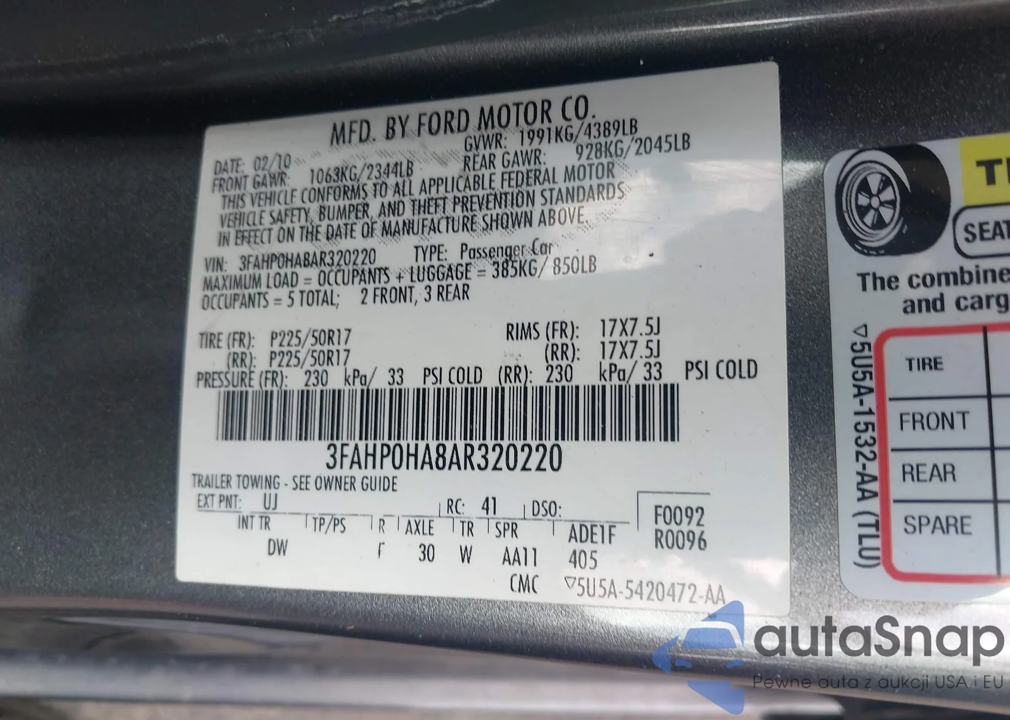 LOT: 42148617 VIN: 3FAHP0HA8AR320220