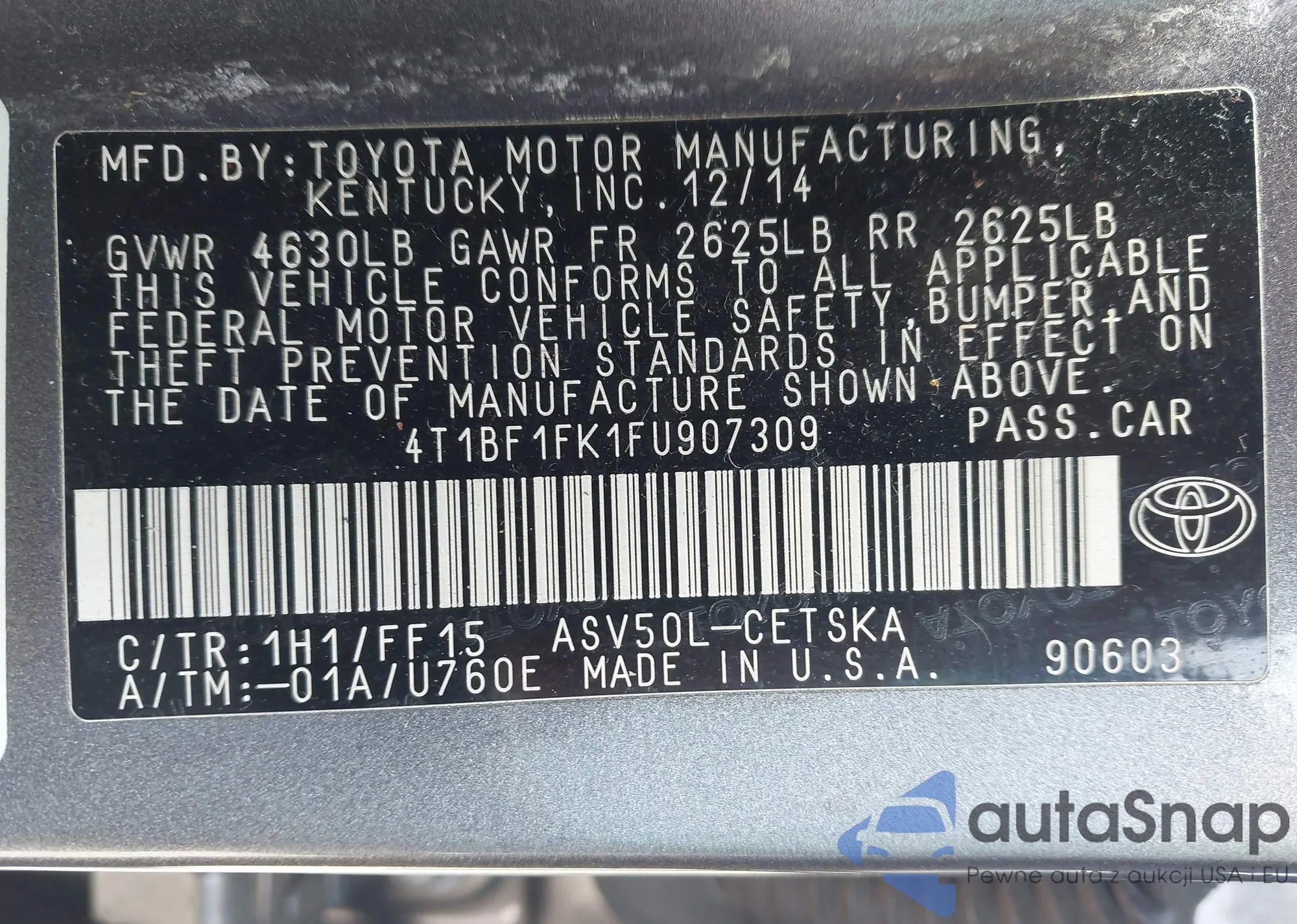 LOT: 42204235 VIN: 4T1BF1FK1FU907309