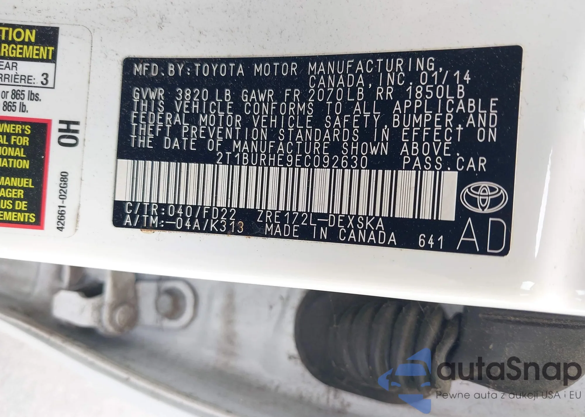 LOT: 42333852 VIN: 2T1BURHE9EC092630