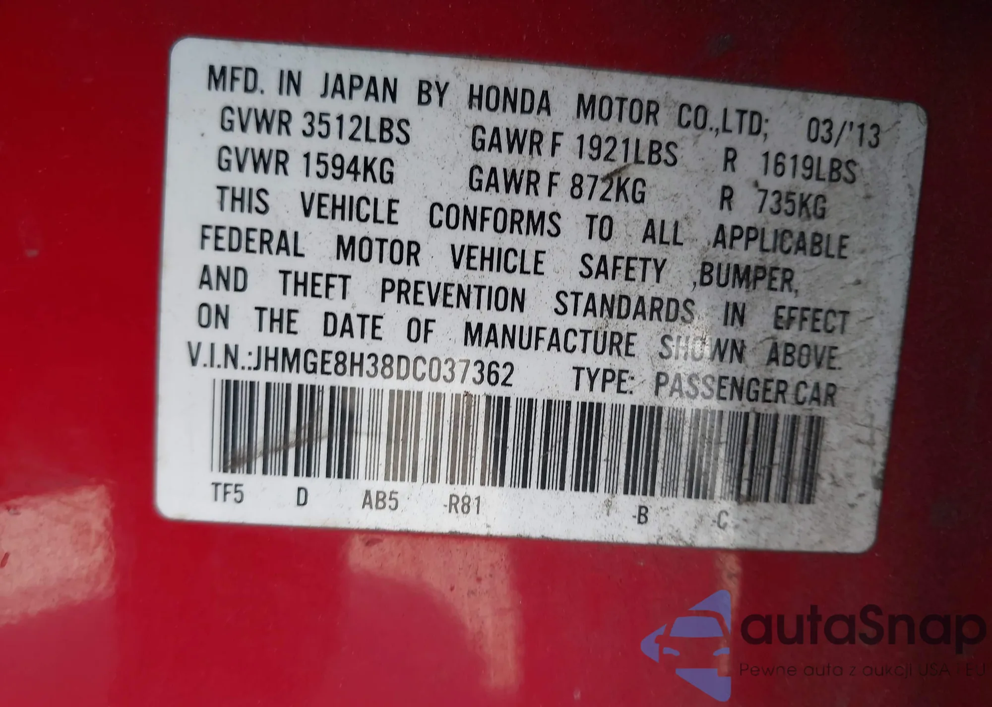 2013 Honda Fit from USA, damaged, VIN JHMGE8H38DC037362