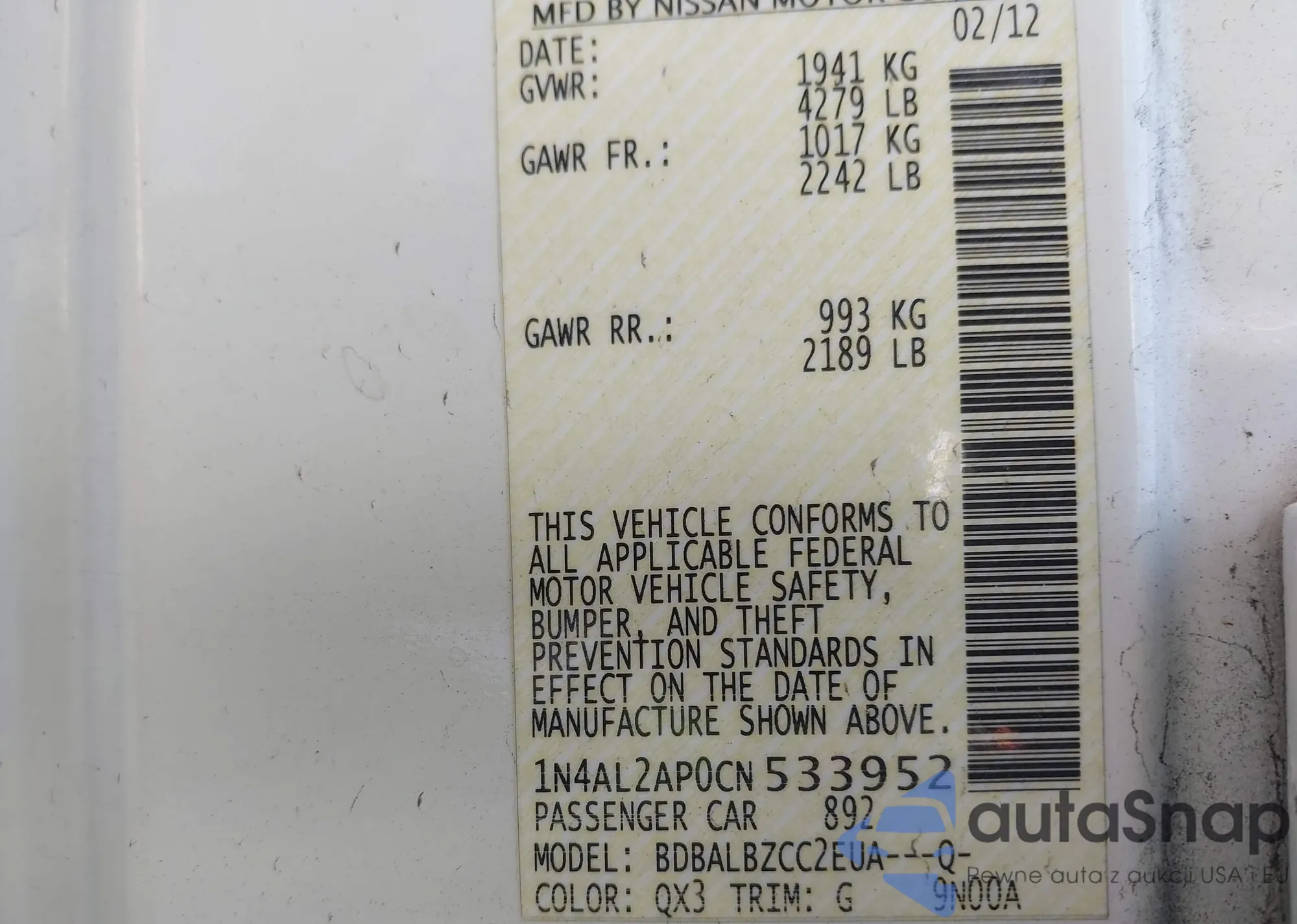 LOT: 41343476 VIN: 5N1BT3AB9SC814386
