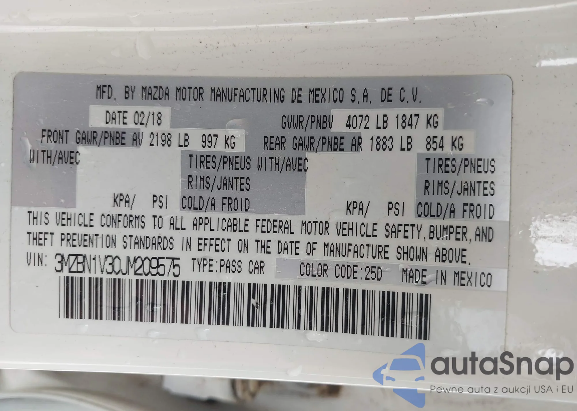 LOT: 42162518 VIN: 3MZBN1V30JM209575