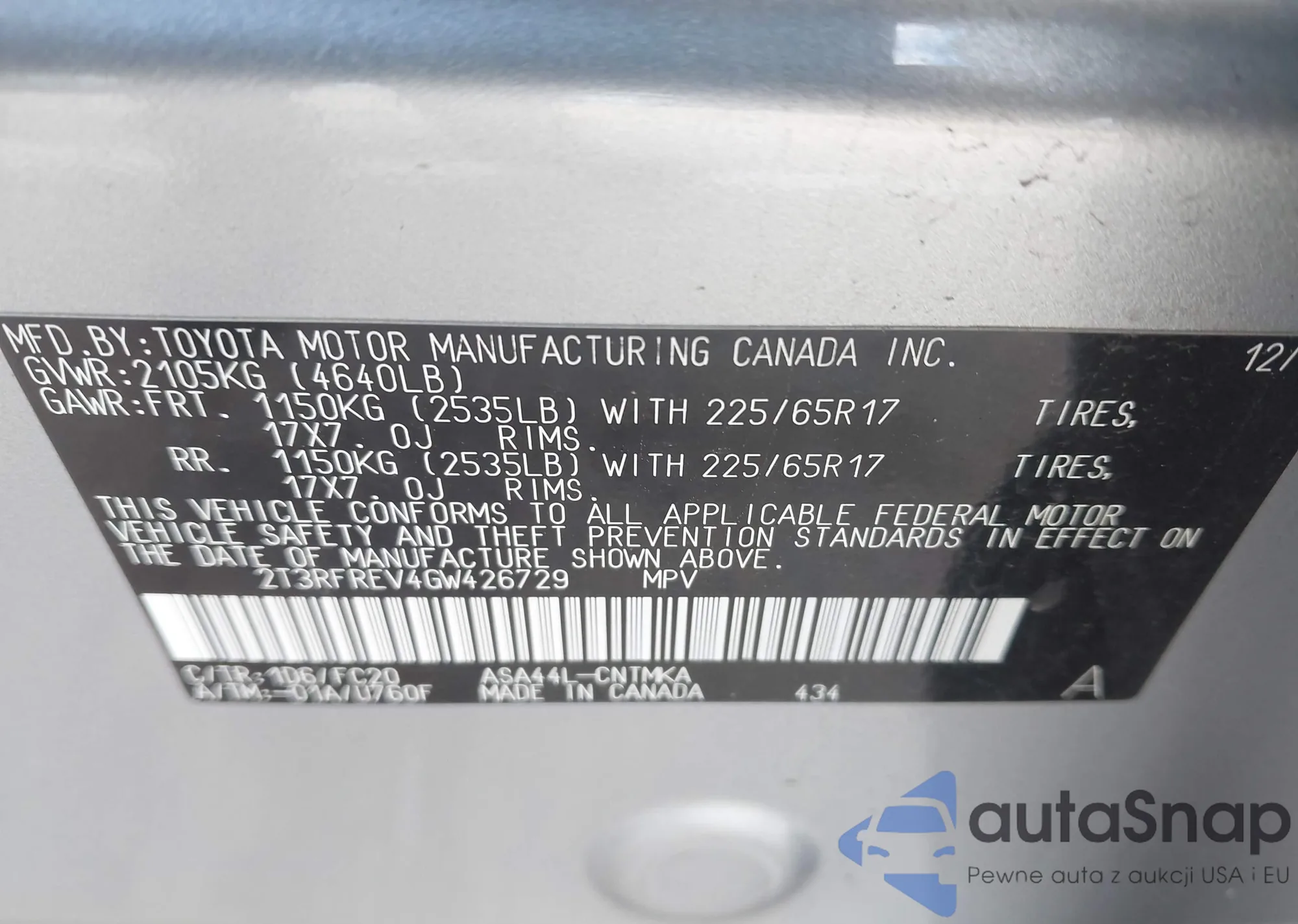 LOT: 42193810 VIN: 2T3RFREV4GW426729