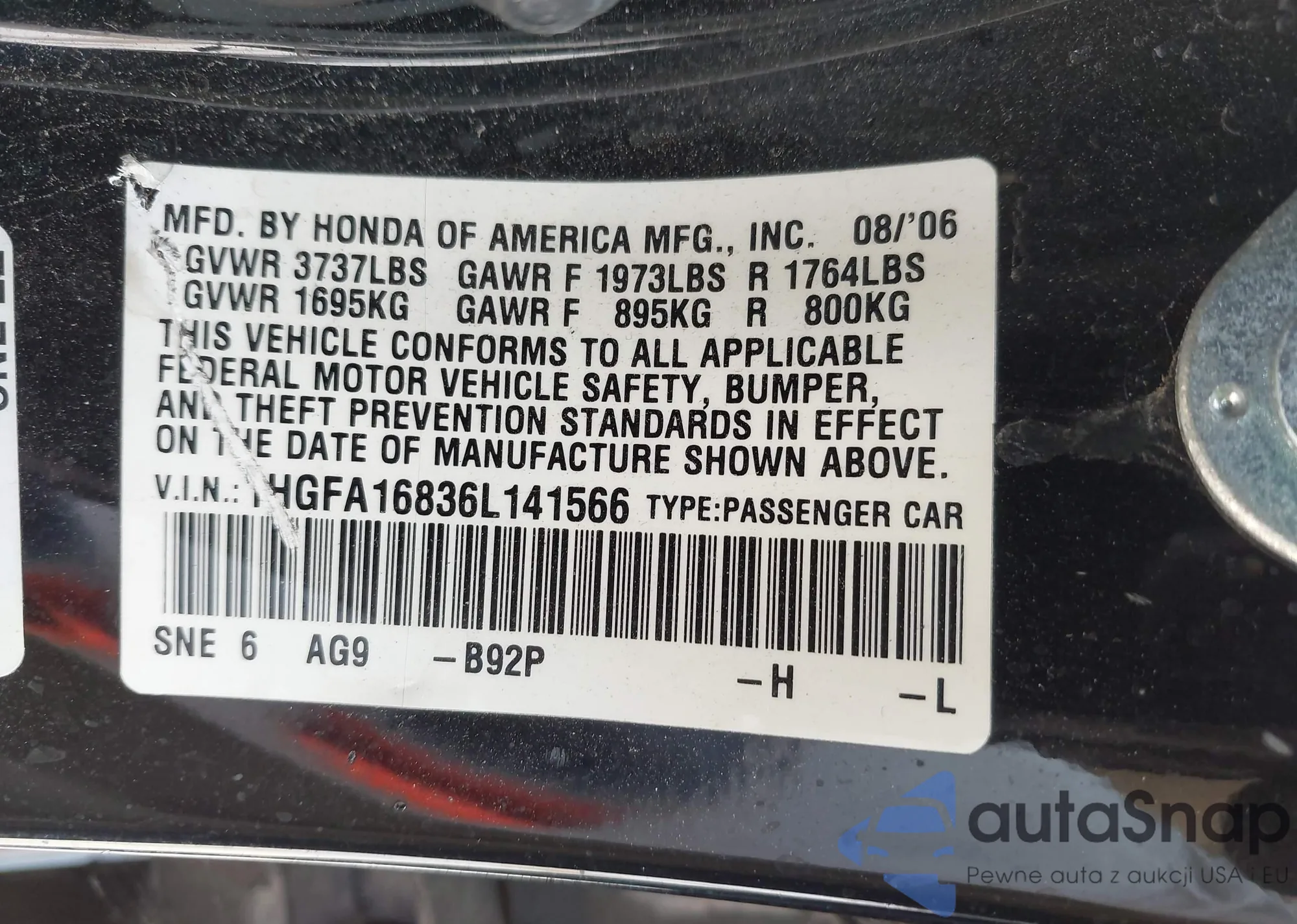 LOT: 42197391 VIN: 3HGCM56333G709703