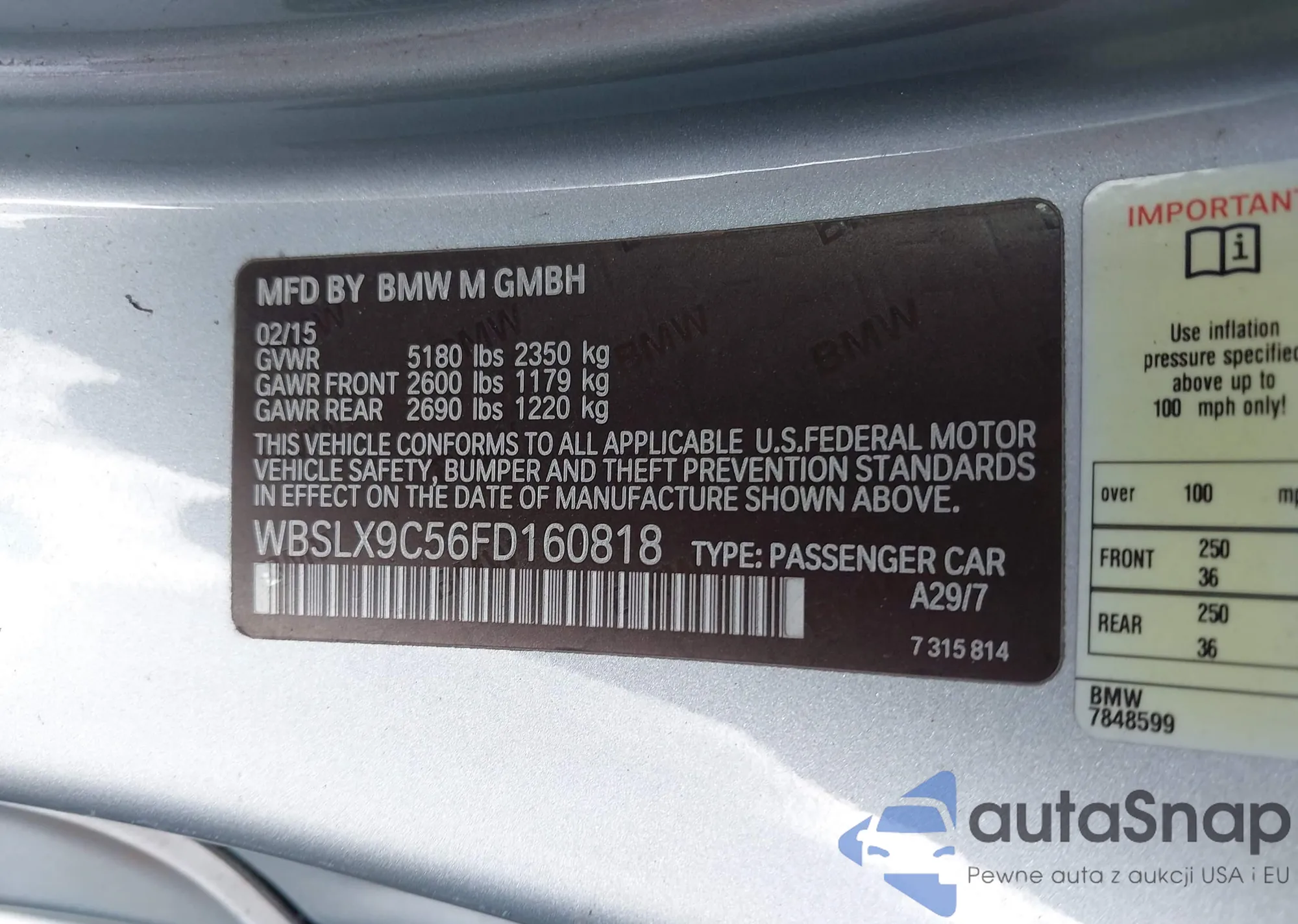 LOT: 40955559 VIN: WBSLX9C56FD160818
