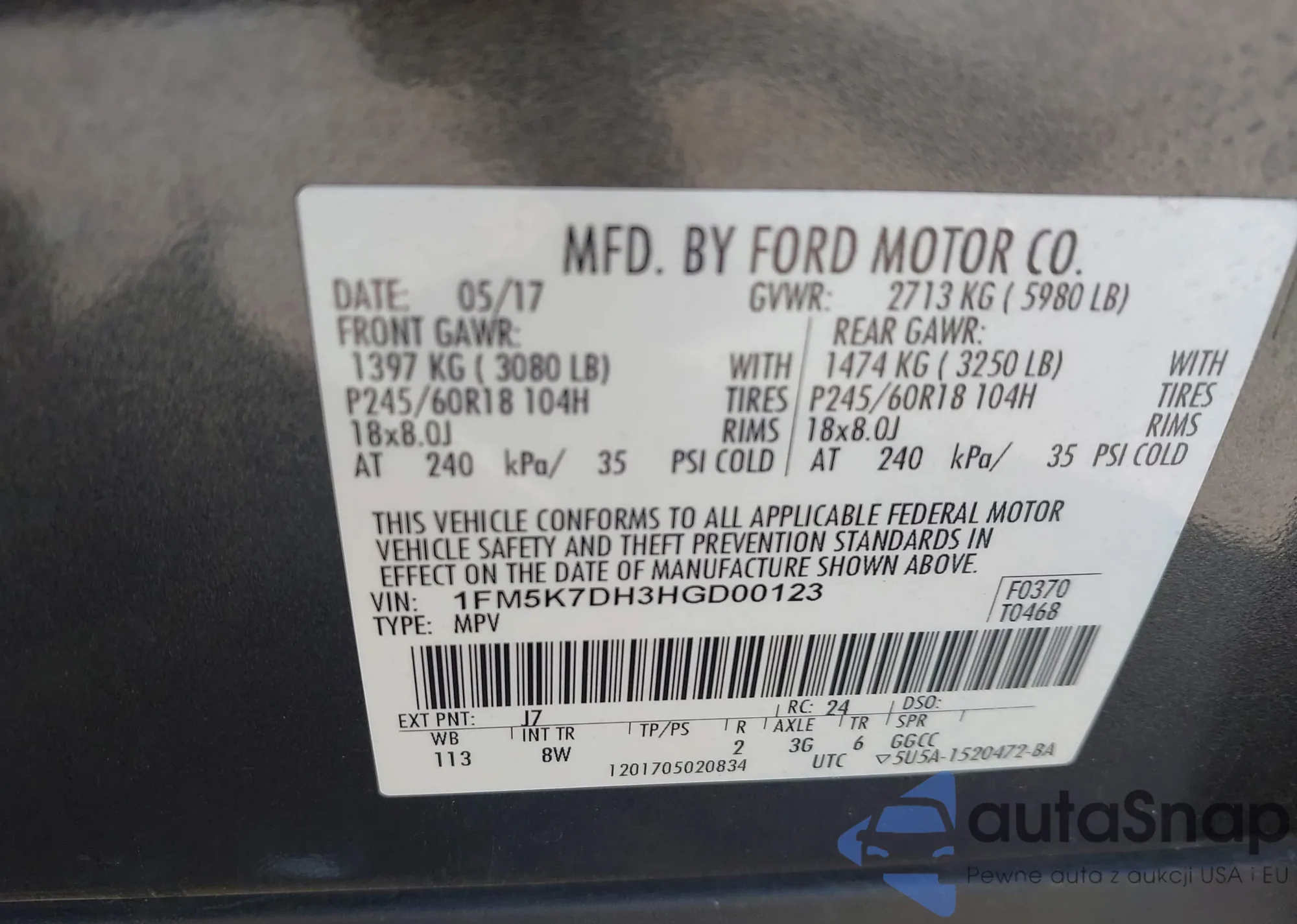 LOT: 41865728 VIN: 1FM5K7DH3HGD00123