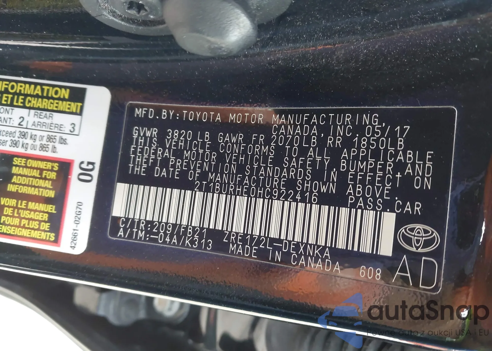 LOT: 42002962 VIN: 2T1BURHE0HC922416