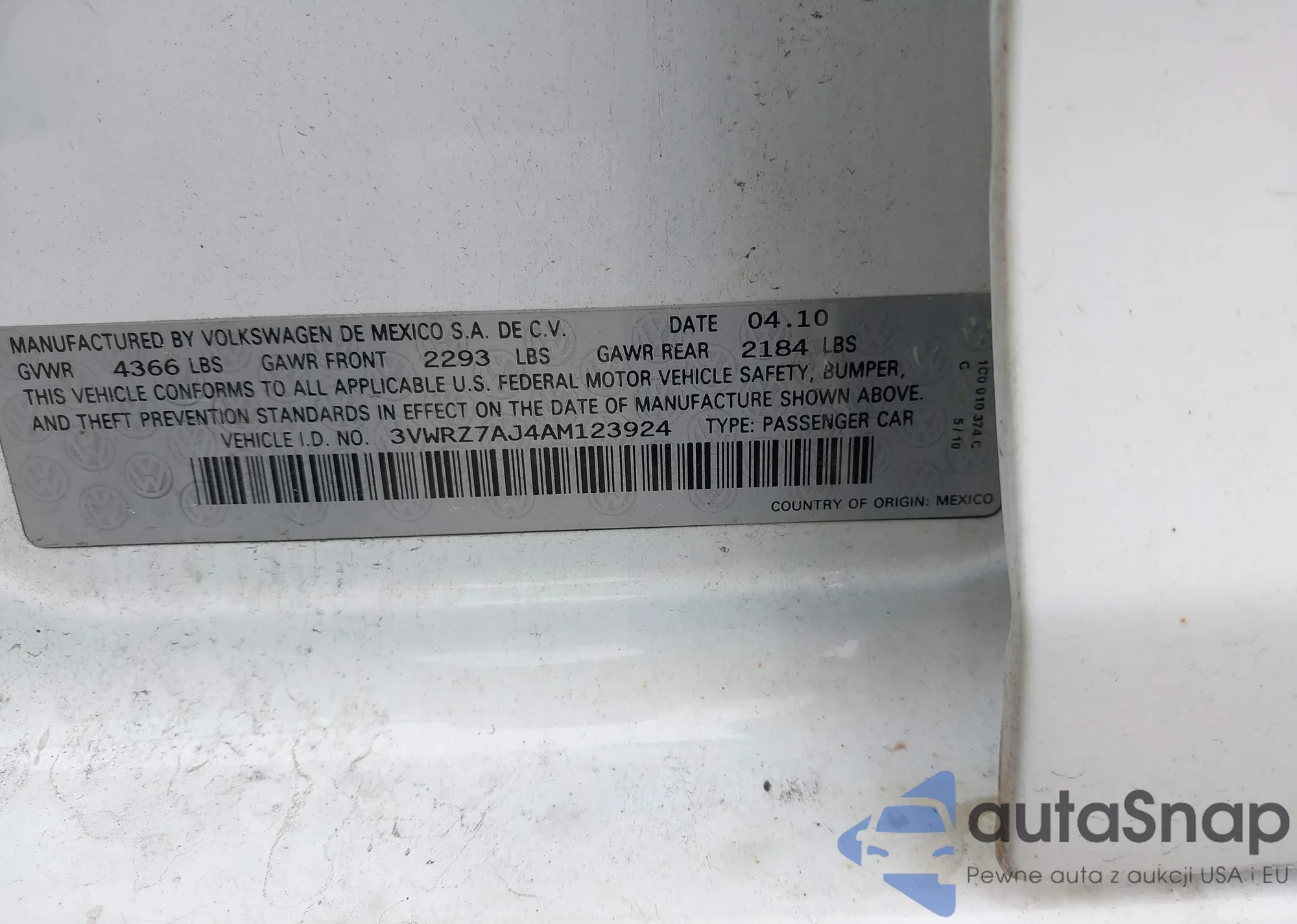 • VIN 3VWRZ7AJ4AM123924