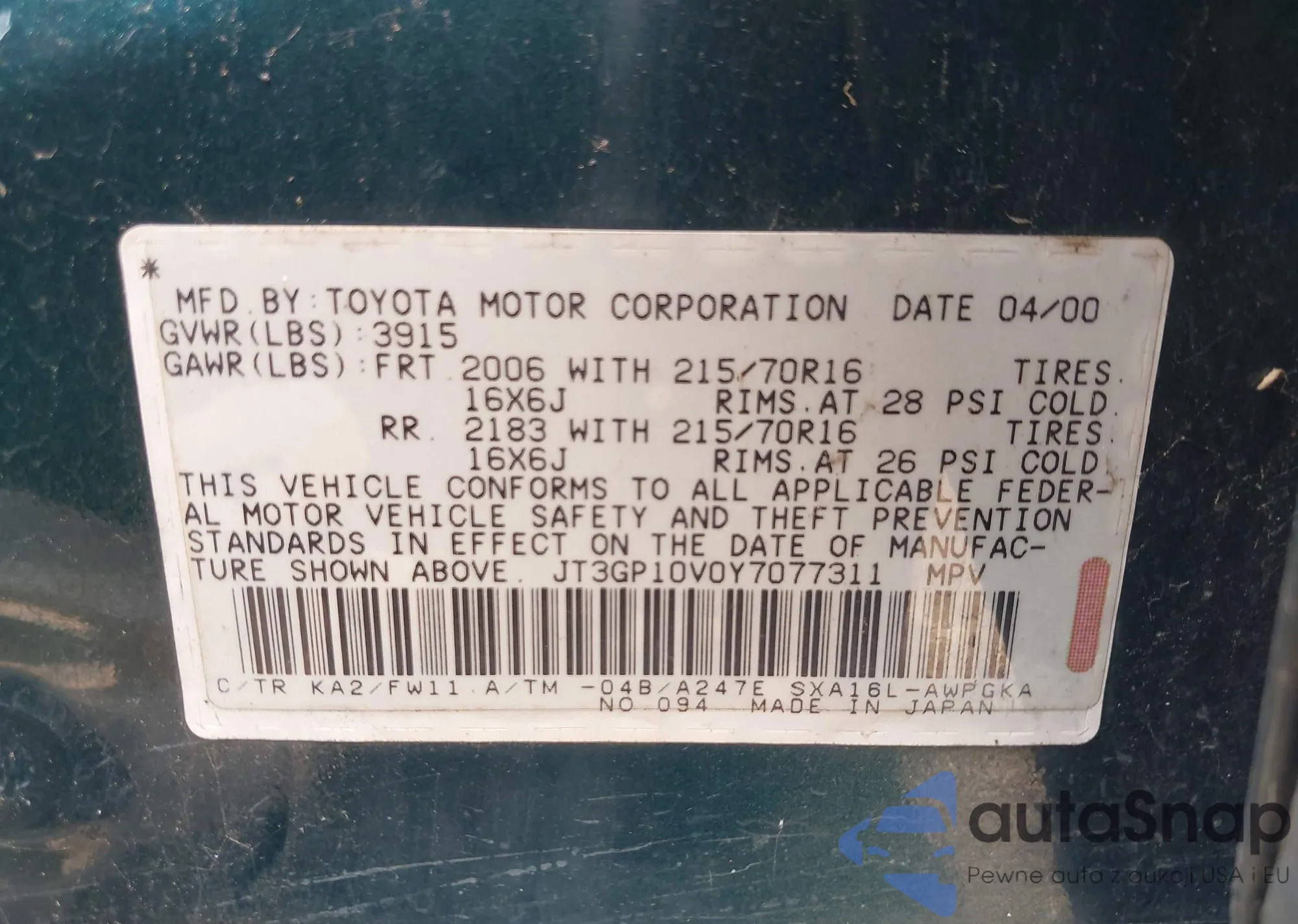 • VIN JT3GP10V0Y7077311