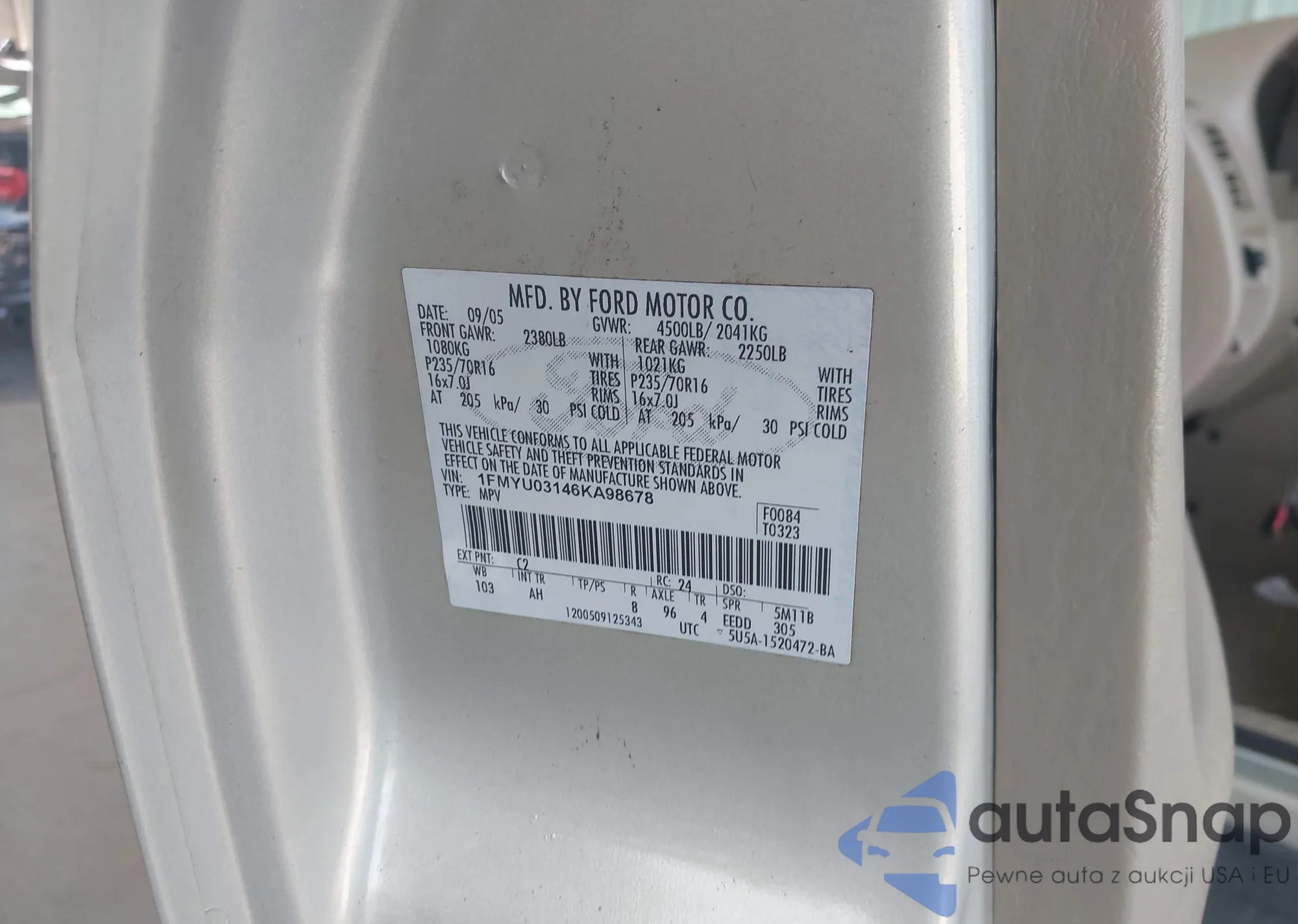 LOT: 42337928 VIN: 1FMYU03146KA98678