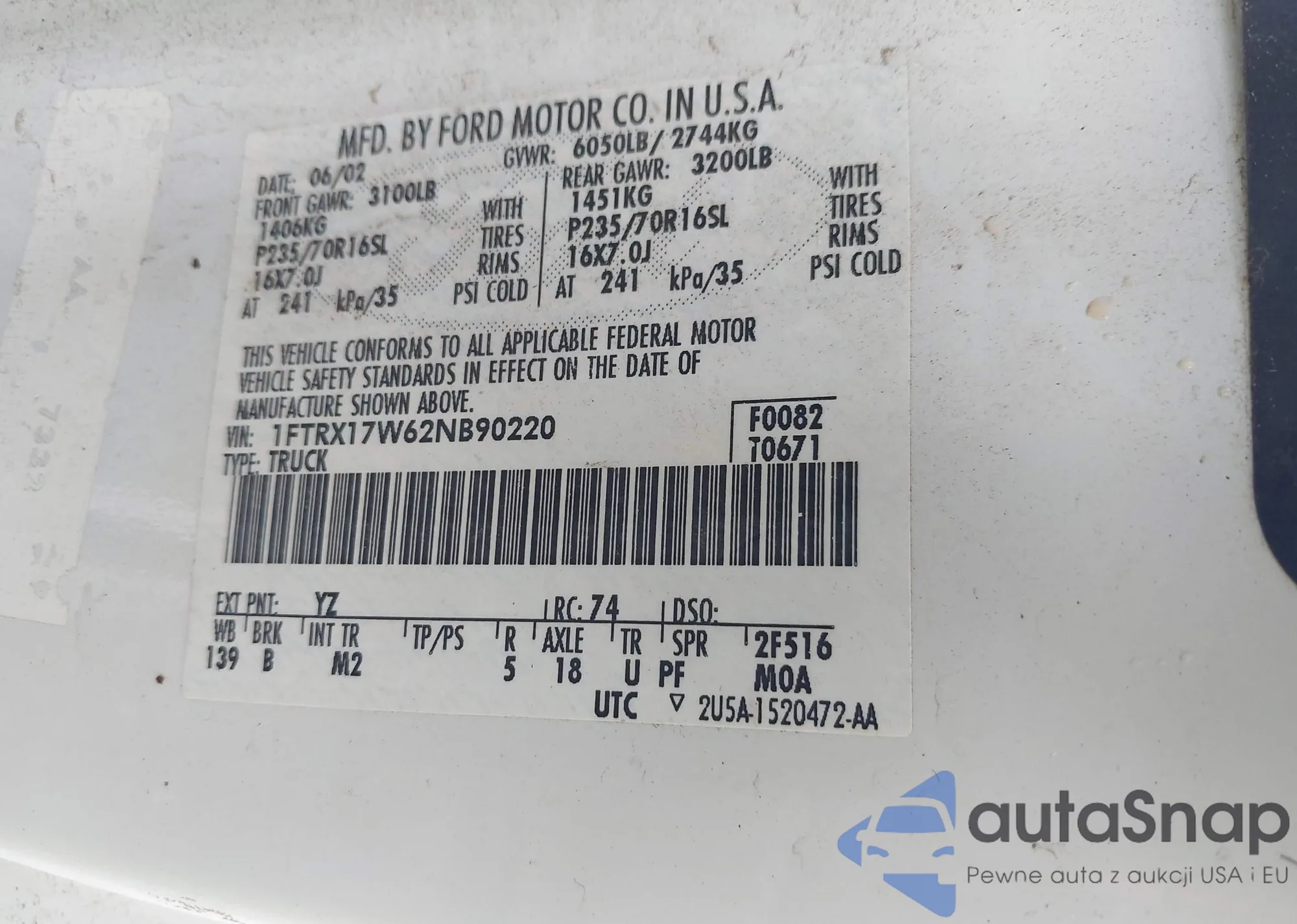 • VIN 1FTRX17W62NB90220