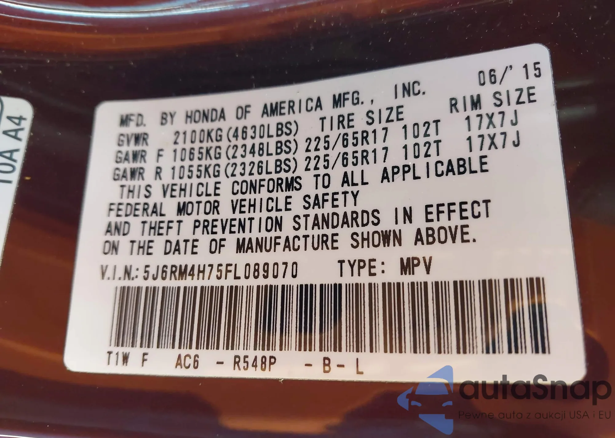 • VIN 5J6RM4H75FL089070