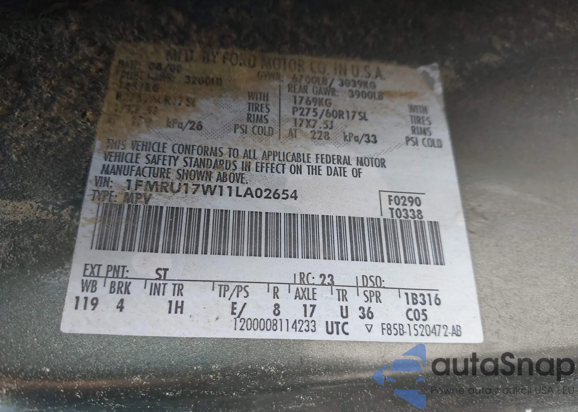 LOT: 42147534 VIN: 1FMRU17W11LA02654