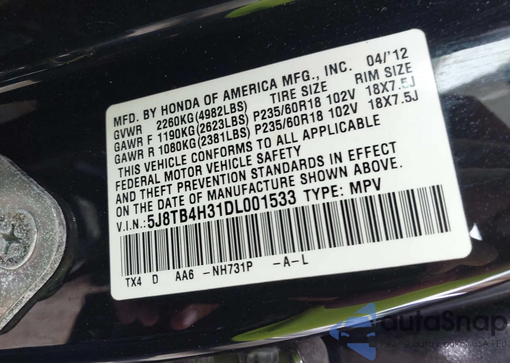 • VIN 5J8TB4H31DL001533