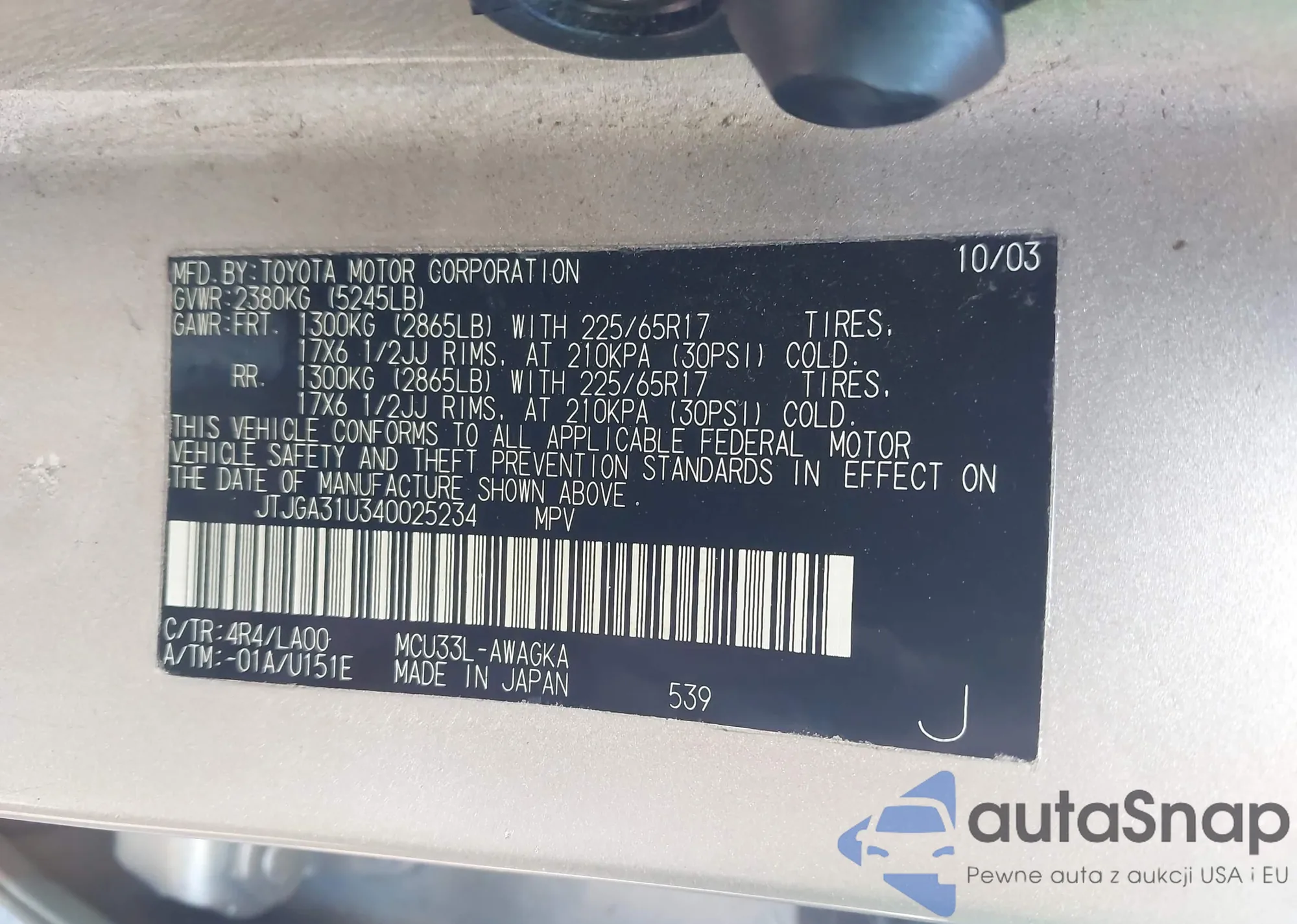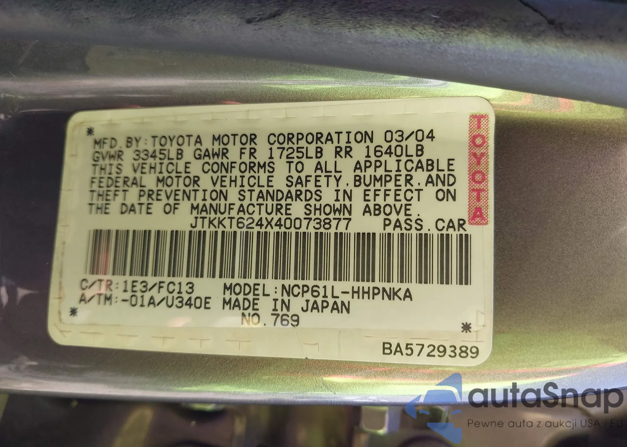 LOT: 42321335 VIN: JTKKT624X40073877