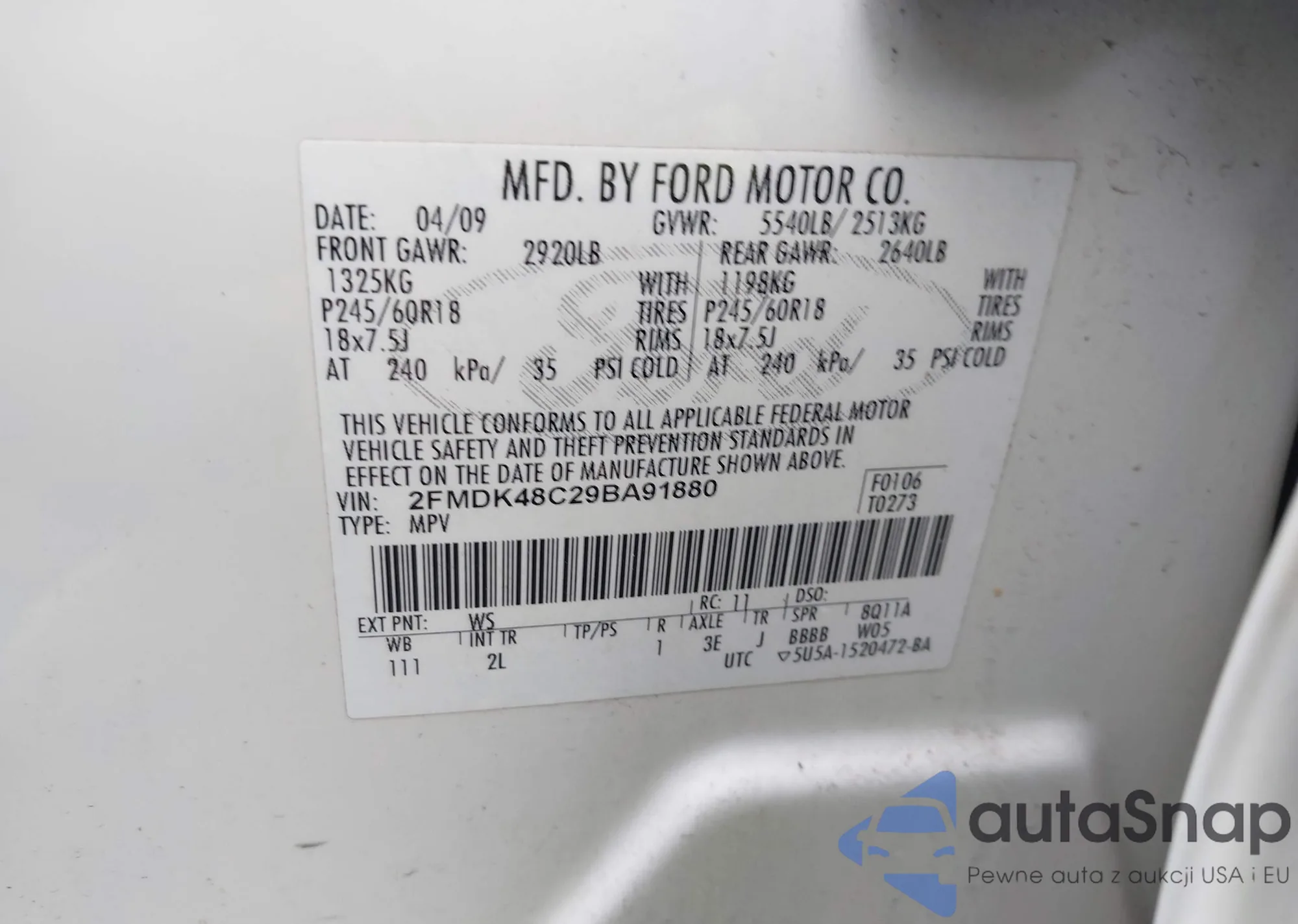 • VIN 2FMDK48C29BA91880