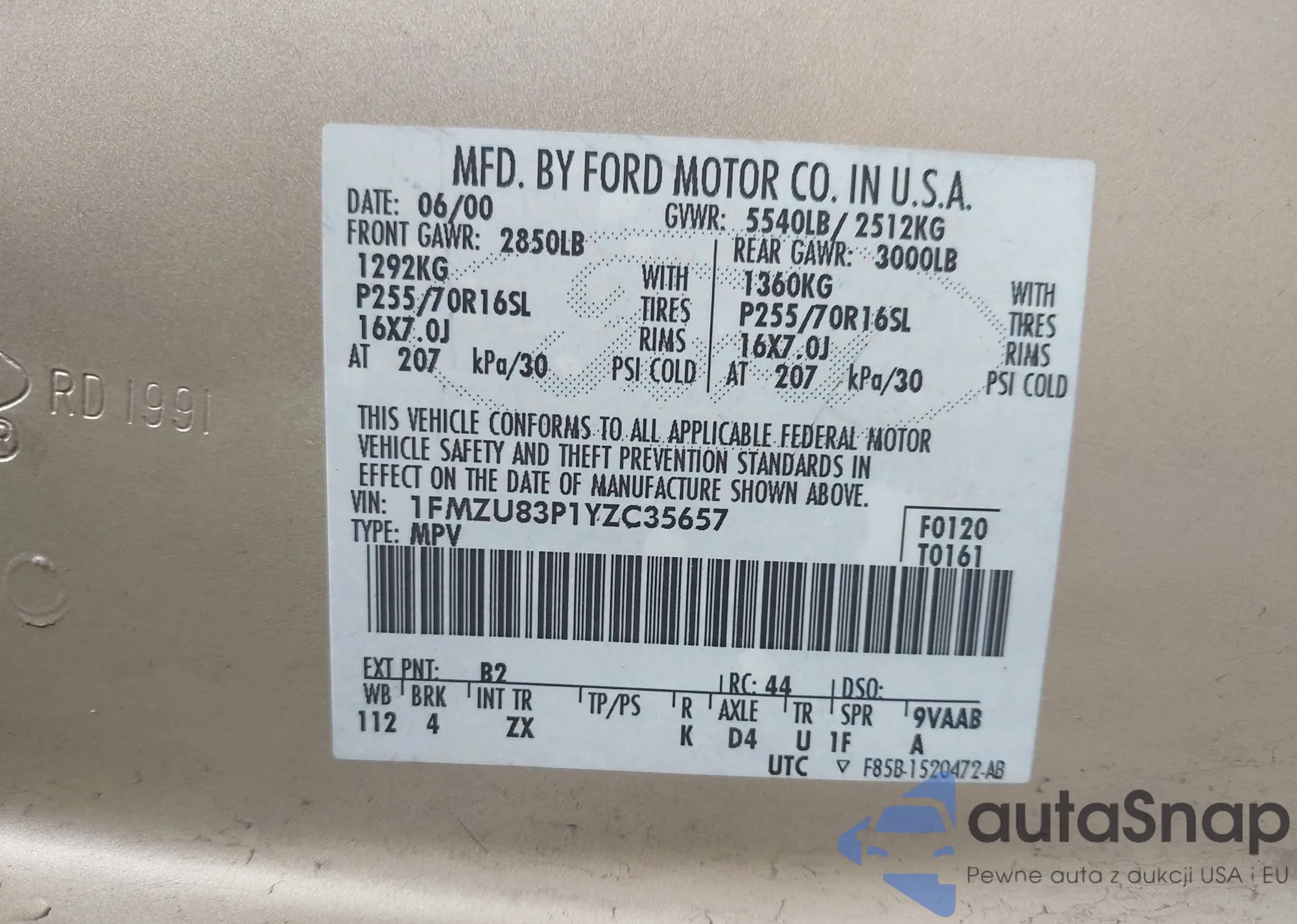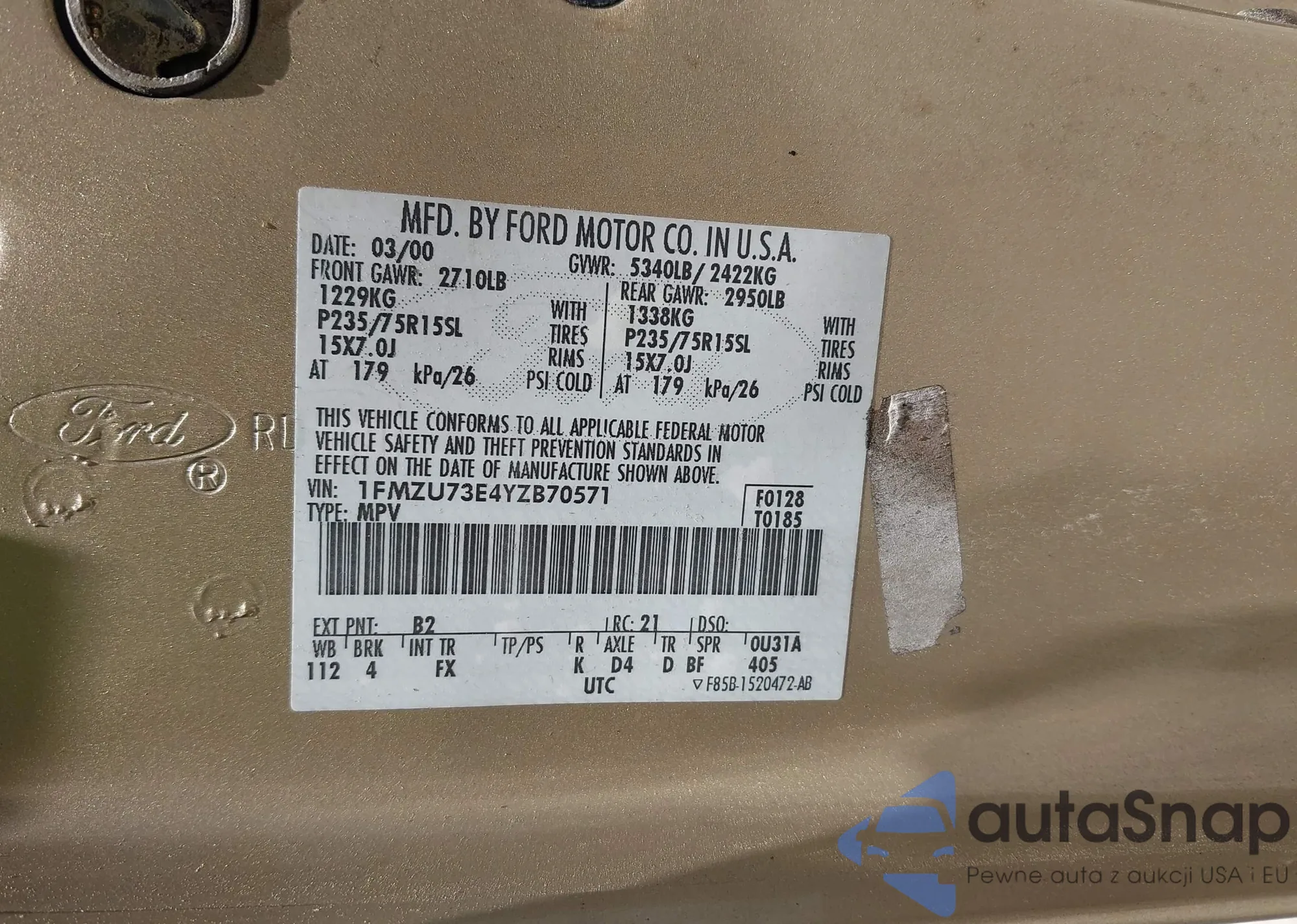 LOT: 42317419 VIN: 1FMZU73E4YZB70571