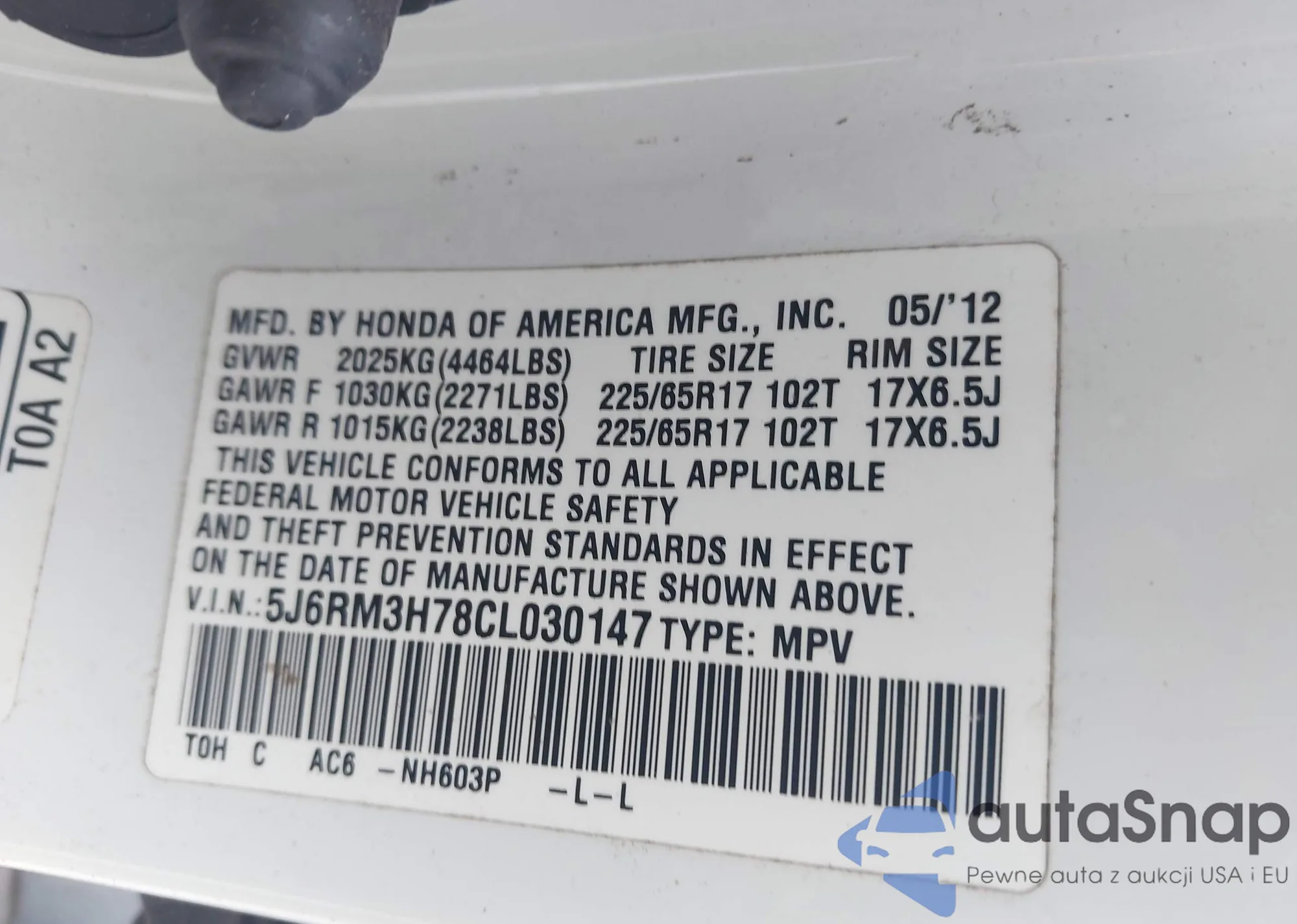 • VIN 5J6RM3H78CL030147