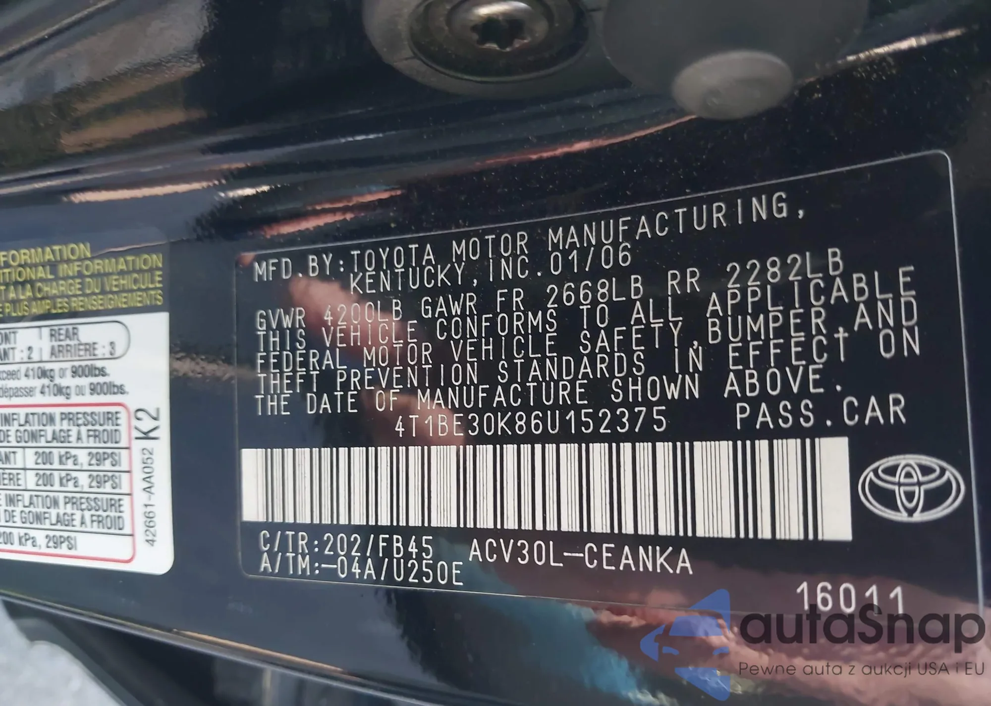 • VIN 4T1BE30K86U152375