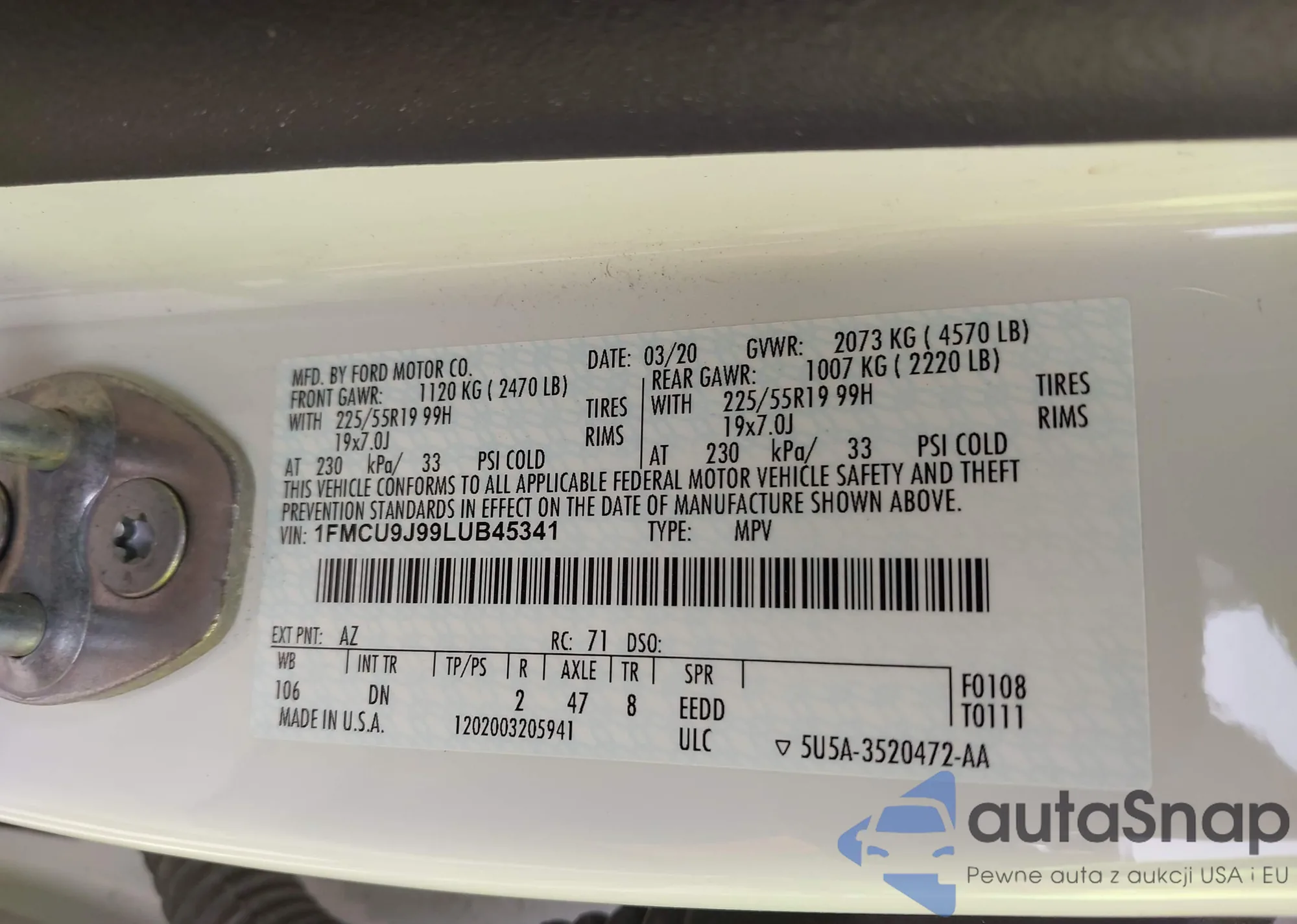 • VIN 1FMCU9J99LUB45341