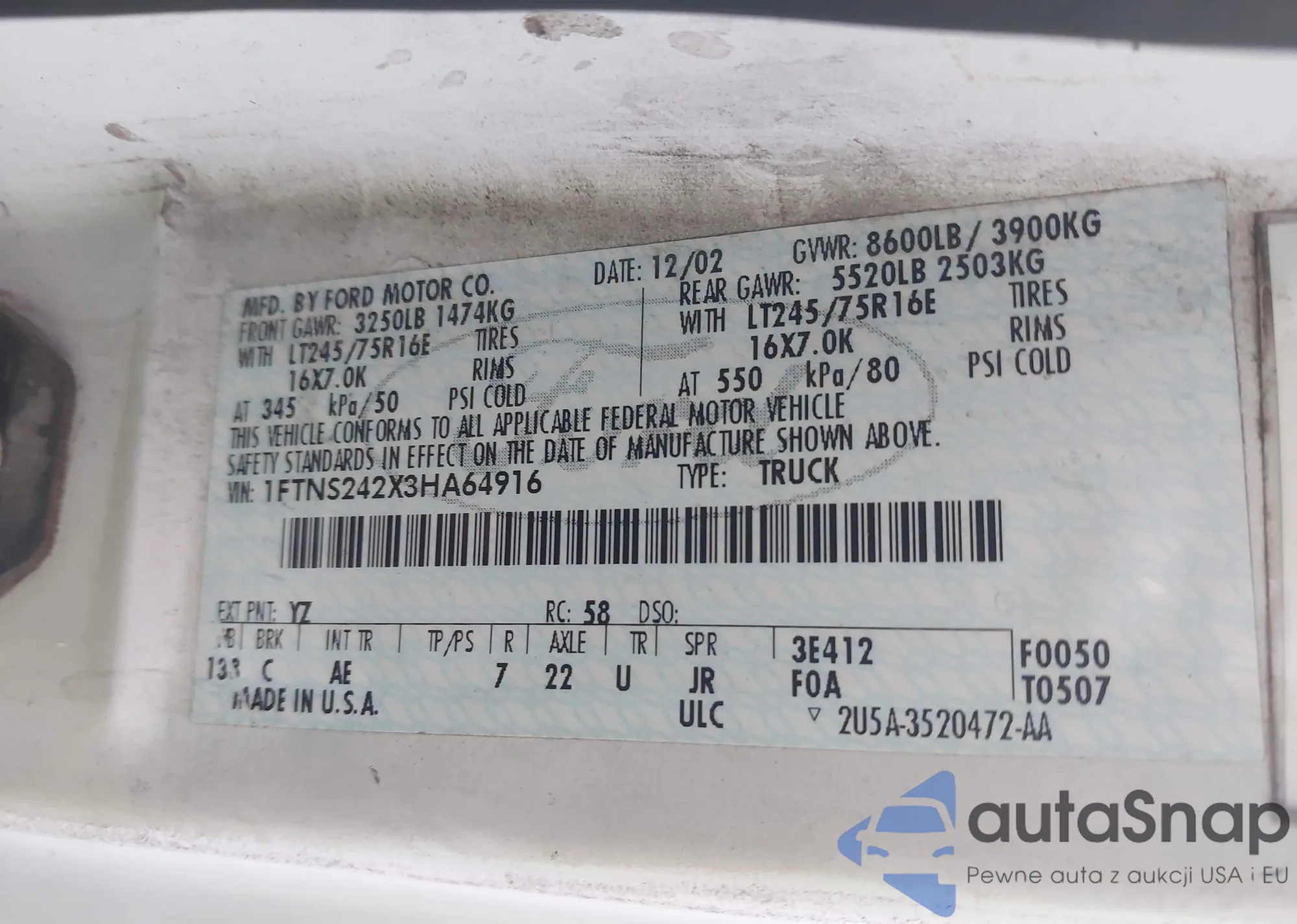 • VIN 1FTNS242X3HA64916