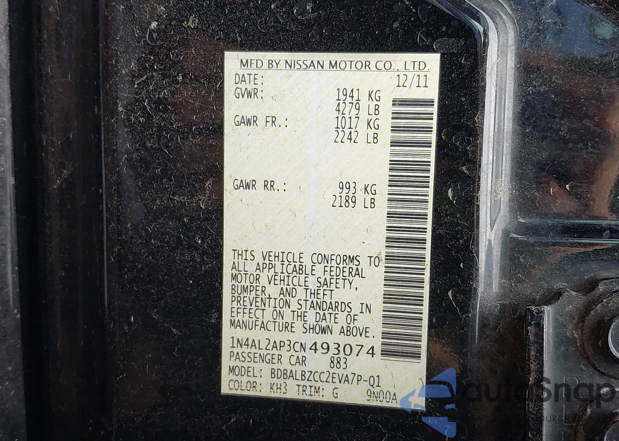 LOT: 39953879 VIN: 1N4AL2AP3CN493074